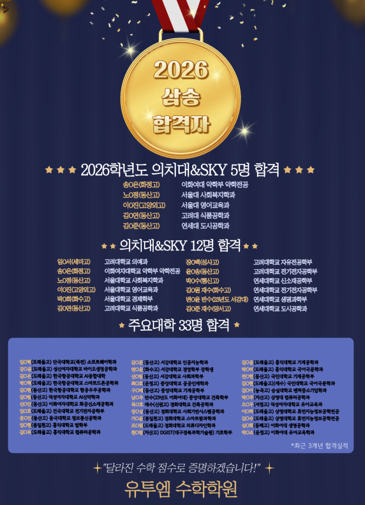 2026 삼송 유투엠 입시 결과, 올해만 의치대&SKY 5명 합격!