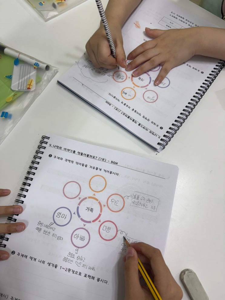 멜로디를 고르고, 리듬을 붙이고, 오선지 위에 소리를 옮긴 뒤, 수업은 이제 ‘소리’에서 ‘이야기’로 넘어가는 단계에 들어갔습니다. 바로 작사를 시작하기보다, 이번에는 노래에 담고 싶은 장면을 먼저 떠올려 보는 시간을 가졌습니다. 이번 수업의 주제어는 ‘가족’이었습니다. 가족과 함께했던 기억 하나를 떠올리고, 마인드맵을 활용해 생각을 정리해 보았습니다. 종이 가운데 ‘가족’을 적고, 그 주변에 떠오르는 장면과 감정을 자유롭게 적어 내려가는 방식입니다. 몇 가지 예시를 보여주자, 아이들은 비교적 자연스럽게 자기 이야기를 써 내려가기 시작했습니다. 맞춤법이나 표현이 헷갈리는 친구들은 손을 들어 도움을 요청했고, 필....... <img src="https://blogthumb.pstatic.net/MjAyNjAxMjZfMzAw/MDAxNzY5NDI2OTYzNzE3.jYp5wQH42Z6BEZkPwkvvC-56v6G_xSOPiqQRYOcIw1wg.QjuUz4Thsrco6Q0_vR3XEsNHz_24gaxquppDVUuzkEgg.JPEG/%C0%DB%BB%E7%C7%CF%B1%E2.jpg?type=s3" />