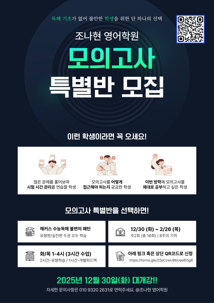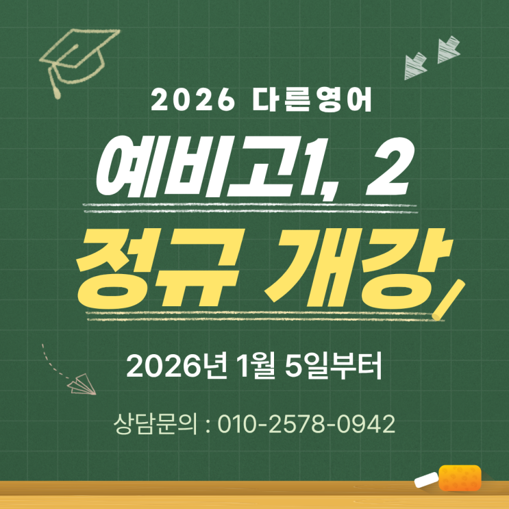 저현고 내신은 시작부터 남다르게! 2026 다른영어 예비고1, 예비고2반이 다가오는 1월 5일부터 정규 개강을 앞두고 있습니다. * 모집은 선착순으로 마감될 예정입니다 :) 레벨테스트 및 기타 문의는 (010-2578-0942)로 부탁 드립니다! <img src="https://blogthumb.pstatic.net/MjAyNTEyMDlfMjMg/MDAxNzY1Mjc0MzA1MzM4.-phEfYdwvRJ1WPFHDRd4V410fMA1U3waTRaWq0HQ8lgg.pLnZ16DSM2e0uFAmtcsV-ghaWneCmeFyTLCPFU99E0Eg.PNG/%BF%B9%BA%F1%B0%ED1_2_%B0%B3%B0%AD.png?type=s3" />