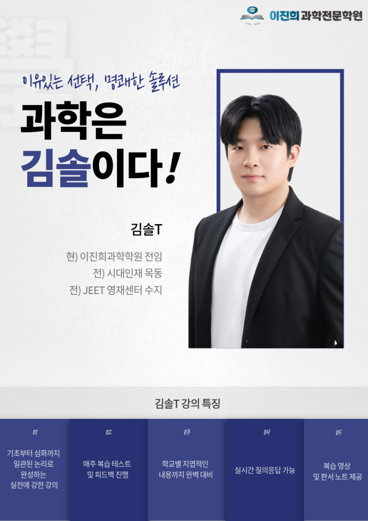 안녕하세요. 이번 신학기부터 새롭게 모시게될 김솔 선생님을 소개합니다. 목동 시대인재뿐만 아니라 용인에 있는 지트 (학생수 2천명 이상의 대형학원)에서 근무하셨던 실력있는 선생님이십니다. 화학과 전공자 답게 깊이있는 수업으로 친절하고 쉽게 설명하시는 스타일이라 기대하셔도 됩니다. 특히 화학을 처음하거나 어려워 하는 학생들은 1단계부터 4단계까지 차근차근 접근할 수 있도록 설명하신다고 하니... 화학에 자신 없는 학생, 화포자 예정인 학생들이라면 꼭 수강하기를 권해드립니다. teaching을 waching으로 끝내버리는 학생들이 많습니다. 김솔 선생님은 학생 한명한명 멘토가 되어 teaching을 coaching으로 만드는 수업이 될 것....... <img src="https://blogthumb.pstatic.net/MjAyNjAyMjVfMjQ1/MDAxNzcyMDA3MjA2MTc3.WawqrqdBuwrsih5YySKmBXMV6jVGcTKA9ho1SaSjjjQg.oK4KaiBx8lRVHNtqqFvif-uvOXRL-MT0QQafj_B6ZQwg.PNG/%B1%E8%BC%D6%C6%BC.png?type=s3" />