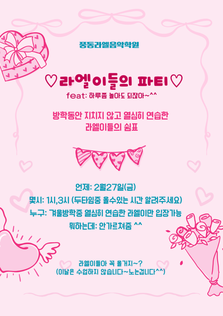 안녕하세요~ #풍동라엘음악학원 입니다!! 2026년에도 어김없이 찾아온 라엘이들의 특강 . . . 2월 27일 금요일 1시 or 3시 (라엘이가 올 수 있는 시간을 알려주세요!) 라엘이들아 특강날에 보자~ 사랑과 즐거움이 넘치는 풍동라엘음악학원 언제든지 저희 풍동라엘음악학원으로 문의 주시기 바랍니다 ;) 031-908-1191 010-7765-1191 그럼 학원에서 만나요~! <img src="https://blogthumb.pstatic.net/MjAyNjAyMTBfMjY1/MDAxNzcwNjk4MDk0MDUw.WNV_TqNsgsstAYUO4rVqHOH3UV98i4s9_YC2Dndryj0g.ni-K_kdP746BnkW58mcveuffbj7HHFaH8Iz5BRsvTG4g.PNG/IMG%A3%DF0505.PNG?type=s3" />