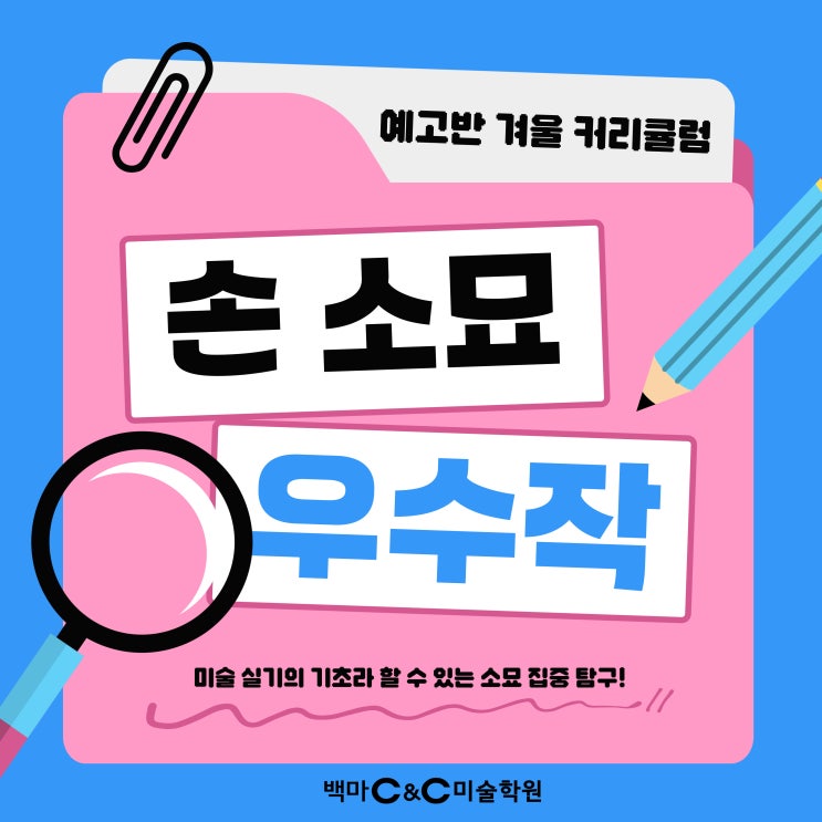 안녕하세요 백마C&C미술학원 예고반 입니다~^^ 오늘은 미술 실기의 기초라고 할 수 있는 소묘! 그것도 예고 입시 실기에서 빠질 수 없다는 손 소묘 수업 내용과 입시반 학생들의 수업작을 보여드리려고 해요~ 이미 그려진 그림 자료를 카피하는 것보다는 실제 정물 혹은 사진자료를 활용해서 그려내는 시간들이 많아야 자료가 없는 실전에서도 당황하지 않고 잘 그려낼 수가 있다고 생각하는데요~ 예고 입시반 학생들은 카피작에서 벗어나 실제 본인의 손이나 사진자료를 토대로 실기수업을 꾸준히 진행하고 있습니다. 그중 겨울방학 커리큘럼의 첫 번째 수업이었던 손 소묘 우수작을 보여드릴게요~ [ 정 O 중3 김 O 희 학생 수업작 ] [ 백 O....... <img src="https://blogthumb.pstatic.net/MjAyNjAyMTRfMTM5/MDAxNzcxMDU3ODY5MzYx.cZDjVwjM_IQnmASI18iPlAXfeErCYEpBMjhy7WD_ya8g.6VBRGe8kGLQYIfbWEblAQcRkcDNgma37mzUCdr2OsU0g.JPEG/%C1%A6%B8%F1%C0%BB-%C0%D4%B7%C2%C7%D8%C1%D6%BC%BC%BF%E4_-001_-_2026-02-09T143054.836.jpg?type=s3" />