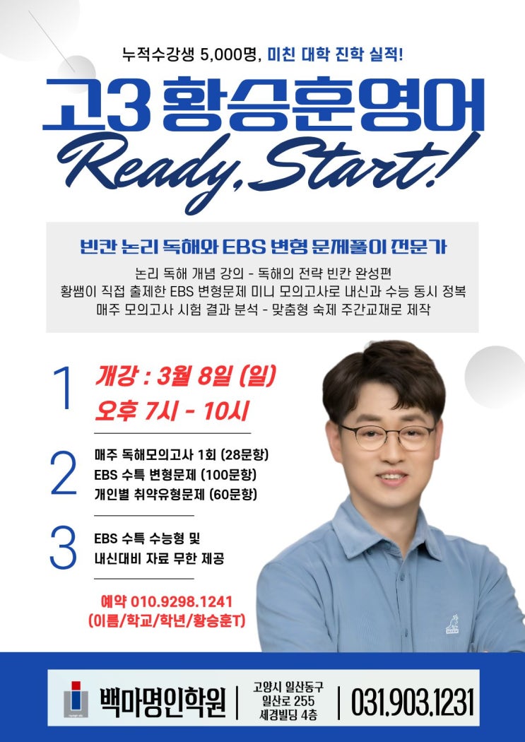 ♣ 고3 황승훈 영어 - 3월 개강 ♣ 일산 영어 수강생 기록 경신중 (누적수강생 5,000명) !! 운정 / 백석 / 대진고 수강생 (매월 300명) 미친 대학진학 실적 (9년 연속 의치대 서울대 다수 배출) 3/8 (일) 개강 오후 7:00~10:00 ※ 빈칸 논리독해와 EBS 변형 문제풀이 전문가 *논리독해 개념강의 – 독해의 전략 빈칸완성편 (3~4월) *황샘이 직접 출제한 EBS 변형문제 미니모의고사 수업으로 내신과 수능을 동시에 정복 *매주 모의고사 시험 결과 분석 - 개인별 맞춤형 숙제를 주간교재로 제작 ※ 매주 독해모의고사 1회 (28문항), EBS수특 변형문제 (100문항), 개인별 취약유형문제 (60문항) 제공 ※ EBS수특 수능형 및 내신대비 자료 무한제....... <img src="https://blogthumb.pstatic.net/MjAyNjAyMTlfNDAg/MDAxNzcxNDgxMjc2OTgy.ZmFTOluBkY8GCcA5zYea7DviO6-l0to_F3zfBJ1zliYg.RFxn7cqnbsyIUDKPGUsMXVhXWS07pgdQMSGIYMYh4Osg.JPEG/%C8%B2%BD%C2%C8%C6T_%B0%ED3_%281%29.jpg?type=s3" />