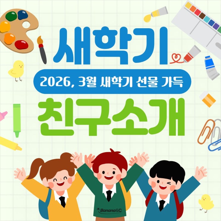 안녕하세요 아이들의 상상력이 즐겁게 자라나는 곳, 백마 바나나엔씨 미술학원입니다. 어느덧 따스한 봄바람이 코끝을 간지럽히는 3월이 되었어요. 새 학년, 새 교실에서 새로운 친구들을 만나며 설레는 하루하루를 보내고 있을 우리 아이들의 미소가 눈앞에 그려지네요. 우리 아이들이 새로운 시작을 더욱 즐겁고 풍성하게 맞이할 수 있도록, 백마바나나엔씨에서 아주 특별한 '새학기 친구 소개 이벤트'를 준비했습니다! 소중한 친구와 함께 그림을 그리면 어떤 점이 가장 좋을까요? 친구와 함께하는 미술 시간은 우리 아이들에게 엄청난 시너지 효과를 가져다준답니다! 같은 주제로 그림을 그려도, 우리 아이들....... <img src="https://blogthumb.pstatic.net/MjAyNjAzMTJfODYg/MDAxNzczMjc4MjczNjM1.HG30LGTpUDtb4P7pAs133yh5CJUE7uY6JSzPShe_vsMg.BiDqf7ZyydAt-Sjn8uL5L9Xzd6-xJAGu_pG0io0Da34g.JPEG/%C1%A6%B8%F1%C0%BB_%C0%D4%B7%C2%C7%D8%C1%D6%BC%BC%BF%E4._%281%29.jpg?type=s3" />