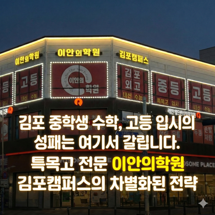 안녕하세요, 특목고 전문 이안의학원 김포캠퍼스입니다. 2026년 현재, 급변하는 교육 과정과 고교학점제 전면 시행 속에서 우리 아이의 '수학' 공부, 안녕한가요? "중학교 때는 곧잘 했는데, 고등학교 가서 무너졌다"는 선배 엄마들의 이야기가 남 일처럼 들리지 않으실 겁니다. 특히 특목고, 자사고, 더 나아가 의치한약수 계열을 목표로 하는 학생이라면 중등 수학은 단순한 '내신 관리'가 아니라 '입시의 체력'을 기르는 시기여야 합니다. 오늘은 왜 김포의 상위권 학생들이 이안의학원 김포캠퍼스로 모이는지, 그리고 중학생 수학 공부의 본질은 무엇인지 심도 있게 다뤄보겠습니다. 1. 중학생 수학....... <img src="https://blogthumb.pstatic.net/MjAyNjAyMTVfMjgx/MDAxNzcxMTQ0Njk0MzQ0.FLWmbQ2CW_1Gl5dFd7A6VDIrMzaeuu3n8vgiBnPaIaQg.jCtT5v1zBpZ3_HP7ZuPl4Pa6UK1Kdhgw0PiDKOJrgcog.PNG/Gemini_Generated_Image_zdppb5zdppb5zdpp.png?type=s3" />