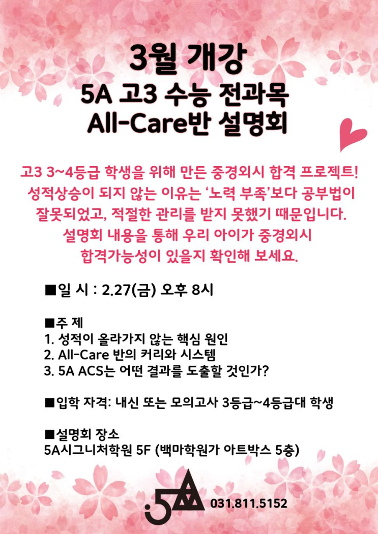 [5A 고3 ACS] 3월 개강 5A 고3 수능 전과목 All-Care반 설명회