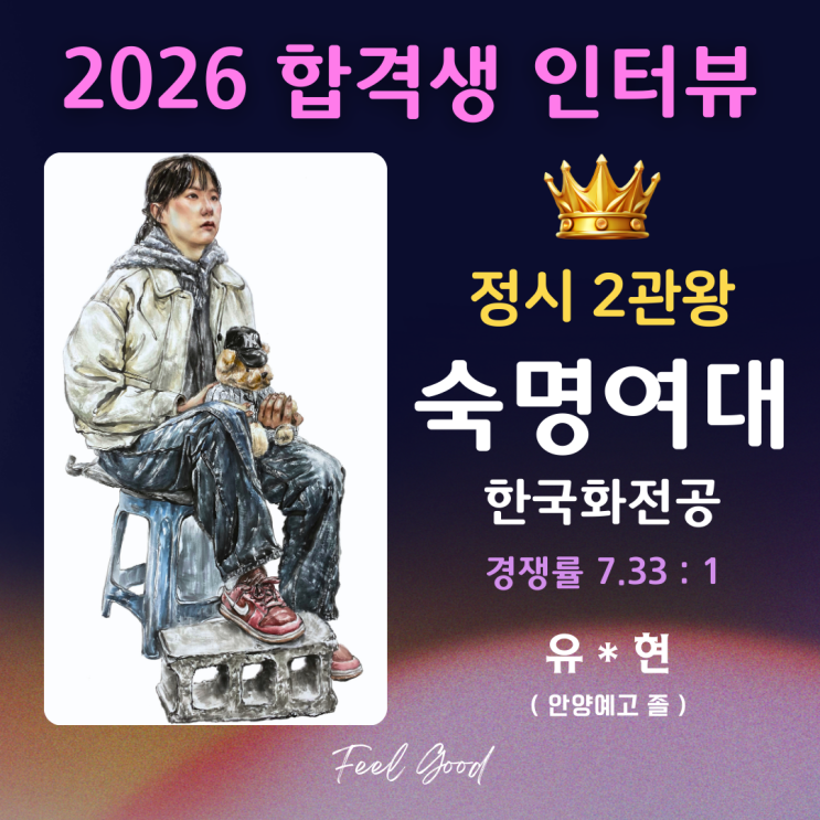 한국화 / 동양화 입시의 새로운 패러다임을 만들어가는 필굿 미술학원 입니다. 지난겨울 감동적인 합격 스토리를 써 내려간 또 한 명의 합격생을 만나보겠습니다. 항상 실기의 찐 고수들이 결집하는 숙명여자대학교에서 경쟁률 7.33:1의 경쟁률을 뚫고 당당히 최초합한 것은 물론, 고작 2명의 학생만을 선발하는 한성대학교 수묵담채 인물 유형에서도 최초합의 결과를 얻어냈습니다. 동양화 대입 준비의 막막함과 어려움을 느끼고 있는 학생들에게 도움이 되길 바라며 합격의 결과 이전엔 어떤 과정이 있었는지 알아보겠습니다! Q. 동양화를 시작한 계기는 무엇이었나요? A. 학교에서 동양화 실기 수업을 통해 전공 선생님들과 동양화에 대한 다....... <img src="https://blogthumb.pstatic.net/MjAyNjAzMTFfMjAg/MDAxNzczMTkyMTc2ODAy.NpNDz-f8pzAKACu_os5wN60jghSaN-SG7igJ4Z6SFy0g.x-j9yoQOaZM3-zaux2KjMFklkWWOy3skKeXDOksSy2cg.PNG/17.png?type=s3" />