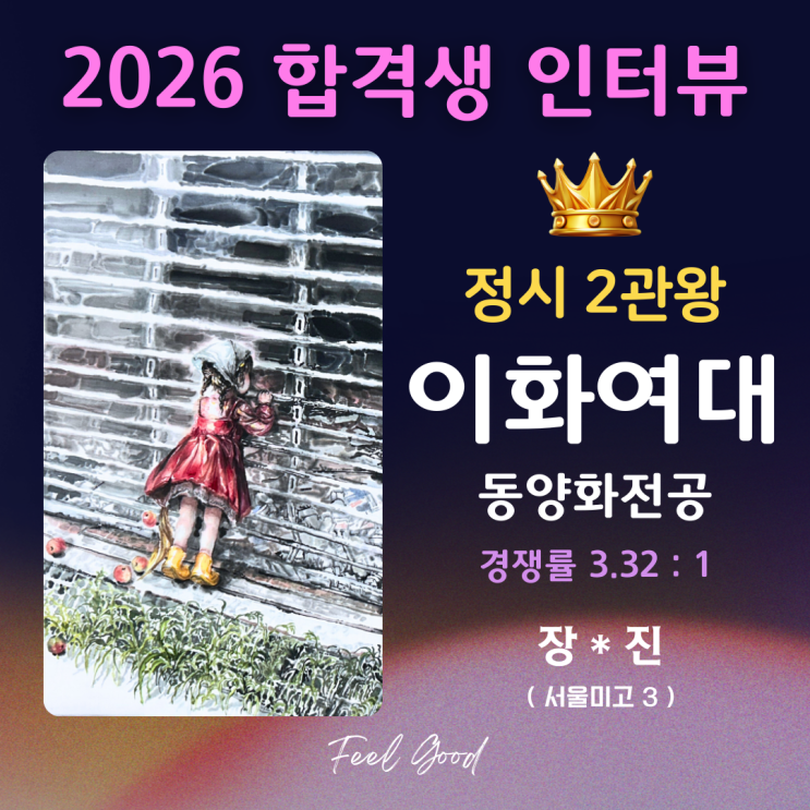 안녕하세요! 필굿 한국화 미술학원입니다. 오늘도 지난 2026 정시에서 값진 성과를 일궈낸 학생의 인터뷰를 소개합니다. 자주 실기고사 형식을 변경하는 이화여자대학교 조형예술학부의 문제를 예측하고 준비하는 과정이 쉽지만은 않았는데요, 과연 어떤 전략과 노력이 있었는지 살펴보겠습니다! Q. 동양화를 시작한 계기는 무엇이었나요? A. 예중 입시 때부터 서양화를 접해왔지만, 동양화는 경험해 본 학생이 거의 없다는 점을 알게 되었습니다. 경쟁 환경을 고려했을 때 동양화를 선택하는 것이 전략적으로 의미 있다고 판단했습니다. 다소 계산적인 선택에서 출발했지만, 작업을 이어가며 동양화만의 매력을 느끼게 되었습니다. 특히 서양화....... <img src="https://blogthumb.pstatic.net/MjAyNjAzMDNfMTMw/MDAxNzcyNTM1MjM0Nzgx.DzjYEJE_fQq_7Jfc21tZANkWIIf4BdSTtAX44KxaG4kg.WCSBW5cUzeUtgekG8Zpk_hSI8r73PGKy9bgJnqnzA68g.PNG/2026_%C1%A4%BD%C3_%C0%CE%C5%CD%BA%E4_%BA%ED%B7%CE%B1%D7.png?type=s3" />