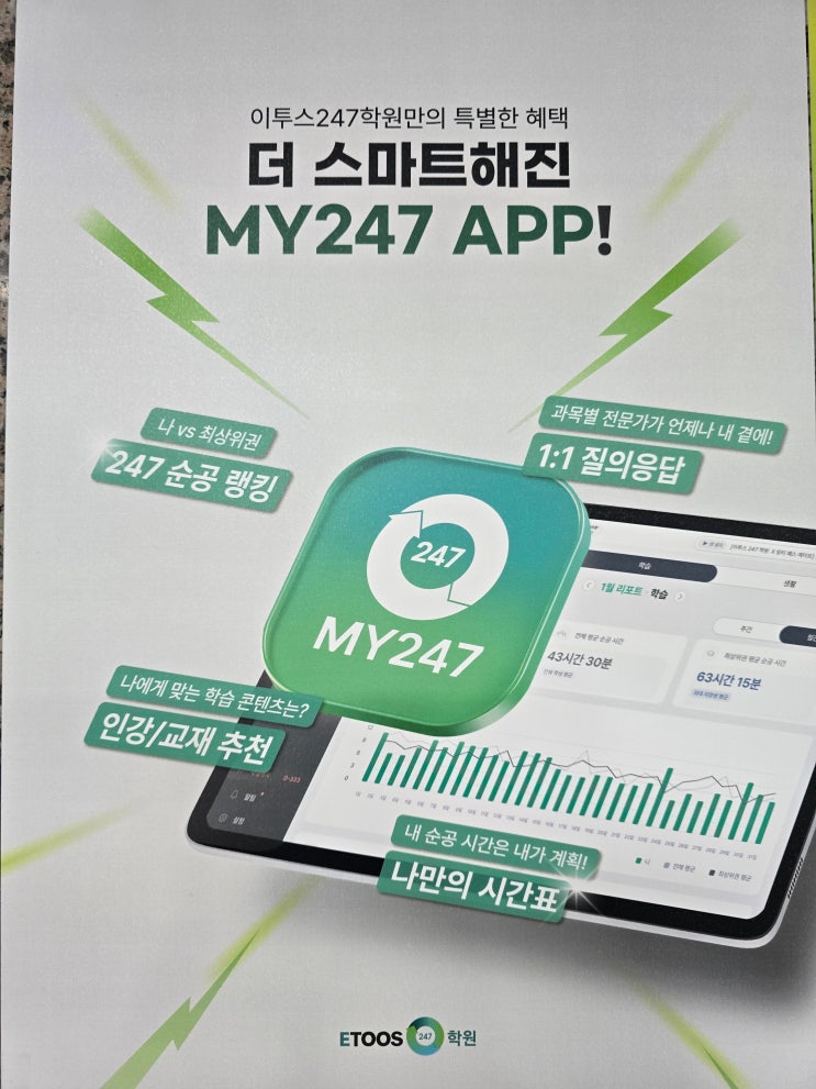 안녕하세요 이투스 247학원 일산서구점입니다. 3.3 부터 학생별 더 스마트해진 247 앱이 시행됩니다. 학생별로 247앱이 실행됨에 따라 다양한 학습지원기능과 생활관리 기능이 추가되어 자기주도학습을 하는 학생들에게 최적의 환경이 만들어졌습니다. 모든 학생이 동일한 진도를 나가는 것이 아니라 일산서구점 학생은 개별맞춤 진도를 나갑니다. 불수능일수록 남의 속도가 아닌 나의 약점에 집중해야 승산이 있습니다. 3.3부터 이투스 247학원 일산서구점 선생님들과 학생들이 함께 만들어가는 최적의 학습시스템을 확인하시기 바랍니다. * 247앱 주요 핵심기능 목표대학 설정 및 선택과목 지정, 수납결제기능, 상담내역관리 나만의 시간표 (주....... <img src="https://blogthumb.pstatic.net/MjAyNjAzMDFfNjgg/MDAxNzcyMzIzMzQ3MTk3.bzjCSfnyYoY5EblnLVhvAQDxUJztFFi9Edd7otSZhZcg.S3ZZqu2ouijcFHlCQAnAmtYEpwn1RdzMuo_V3fnW9aIg.JPEG/20260301_084919.jpg?type=s3" />