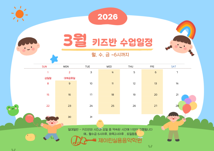 제이린 키즈 제이린 실용음악학원의 특색 초등학생을 위한 실용음악전문반 제이린키즈반의 3월 수업 일정입니다. 월, 수, 금 2시~ 6시까지 운영됩니다. 일대일반은 키즈반외의 시간과 요일 중에서 약속된 시간에 진행됩니다. 월' 수' 금 6시이후 , 화' 목 2시이후 , 토' 일 <img src="https://blogthumb.pstatic.net/MjAyNjAzMDdfOTgg/MDAxNzcyODYyNDI1ODY1.6zyTBKzjqivd9wCyMLXL4rFcpYrC0CgAZuuwpgAAgRAg.qMiJPWpSdNK7bpOiP5KIxvQC3W9XDvZdHGDQkLO71Wog.PNG/%C1%A6%B8%F1%C0%BB-%C0%D4%B7%C2%C7%D8%C1%D6%BC%BC%BF%E4_-002.png?type=s3" />