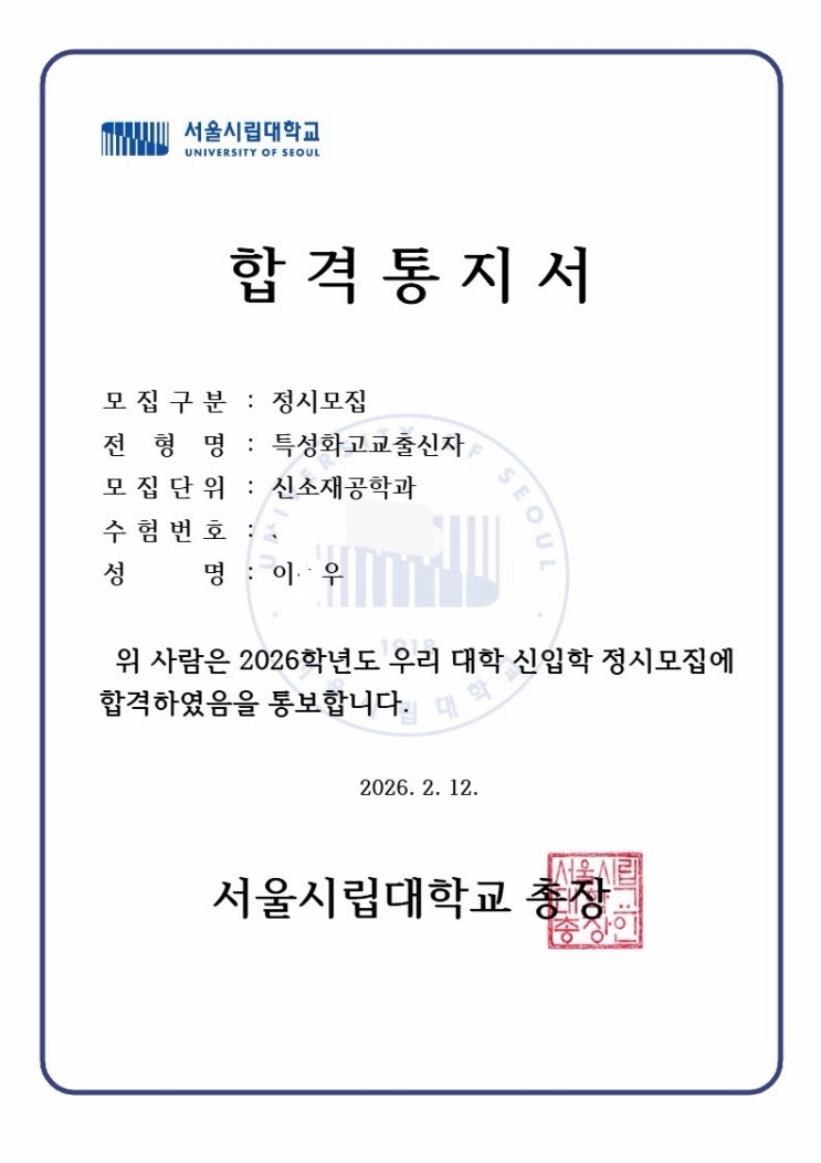 [TN학원] 2026학년도 서울시립대학교 신소재공학과 합격 [경기영상과학고 이*우]
