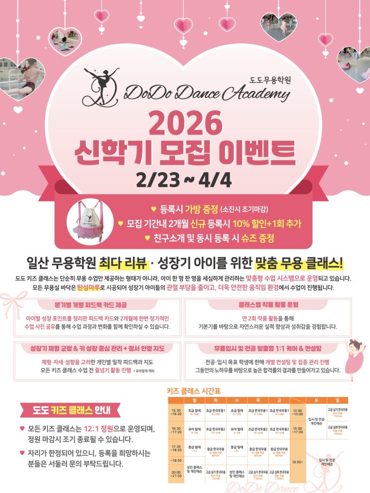 2026 도도무용학원 신학기 모집 이벤트 안내 2026년 신학기를 맞아 도도무용학원에서 키즈 신학기 모집 이벤트를 진행합니다. 아이의 성장 시기에 꼭 필요한 움직임 교육, 도도에서 체계적으로 시작해 보세요❤ 모집 기간 2월 23일 ~ 4월 4일 2026 신학기 등록 혜택 EVENT 1. 모집 기간 내 2개월 신규 등록 시 → 수강료 10% 할인 + 1회 추가 수업 제공 EVENT 2. 선착순 5명 도도 무용가방 증정 선착순 5명에게 도도 키즈 무용가방 증정 EVENT 3. 친구 소개 또는 동시 등록 시 슈즈 증정 2월 26일(목) 초급 한국무용 무료체험 안내 왜 도도무....... <img src="https://blogthumb.pstatic.net/MjAyNjAyMTVfMjI3/MDAxNzcxMTU0OTI3Mjg1.jS00wD9CH4YuZlXy8XbpKll4oOtmexhZ7Hi7faLabwIg.ivdGptBSgP2a-XrOZWR_IyRzA6a38gsz7Ft4GL_uYGIg.JPEG/2026_%BD%C5%C7%D0%B1%E2_%BD%C5%B1%D4_%B8%F0%C1%FD_%C0%CC%BA%A5%C6%AE%28%C3%D6%C1%BE%29.jpg?type=s3" />