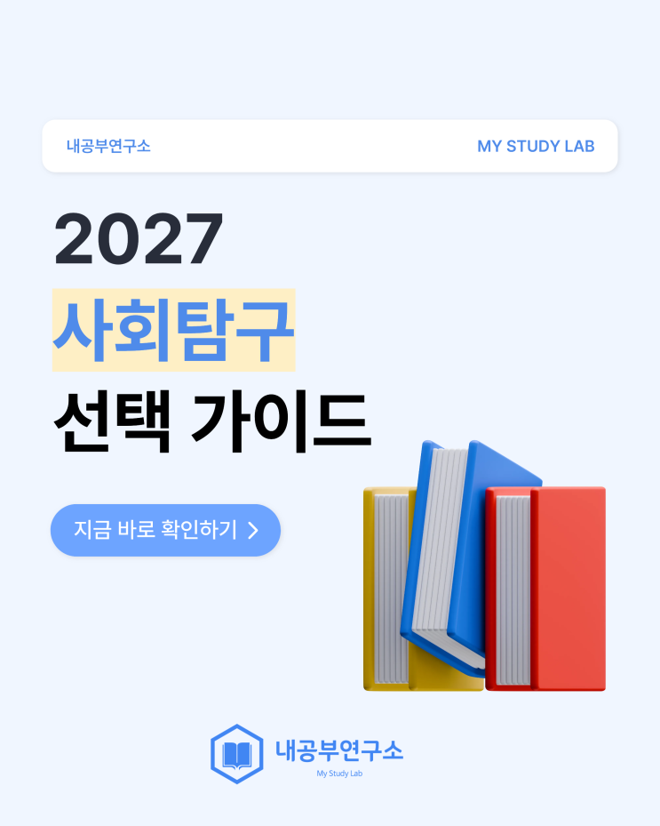 안녕하세요. 내공부연구소입니다! 사회탐구 과목 선택은 단순히 “쉬워 보이는 과목”을 고르는 문제가 아니라, 자신의 성향과 적성, 학습 전략까지 함께 고려해야 하는 중요한 결정입니다. 사회탐구 선택을 앞둔 학생들을 위해 각 과목의 특징과 선택 시 꼭 짚어봐야 할 기준을 간단히 정리했습니다. 내신과 수능을 효율적으로 준비하고 싶은 학생이라면, 내공 사탐 선택 가이드를 통해 자신에게 맞는 사회탐구 과목을 전략적으로 선택해 보시기 바랍니다. #내공부연구소 #일산국어 #후곡국어 #일산과학 #후곡과학 ☎ 교육문의 과학 010-4972-5096 국어 010-8672-5096 <img src="https://blogthumb.pstatic.net/MjAyNjAxMjhfMTQ5/MDAxNzY5NTkyNTAzNTQ2.sI4WPl2GgkjBSzpg4AX0pJerzi0mIpMmCm-Ylo_ujmYg.mP_JaBx92pwxIl088Z5g7RGRcSlWHs5mxYJfdfeoyU8g.PNG/1.png?type=s3" />