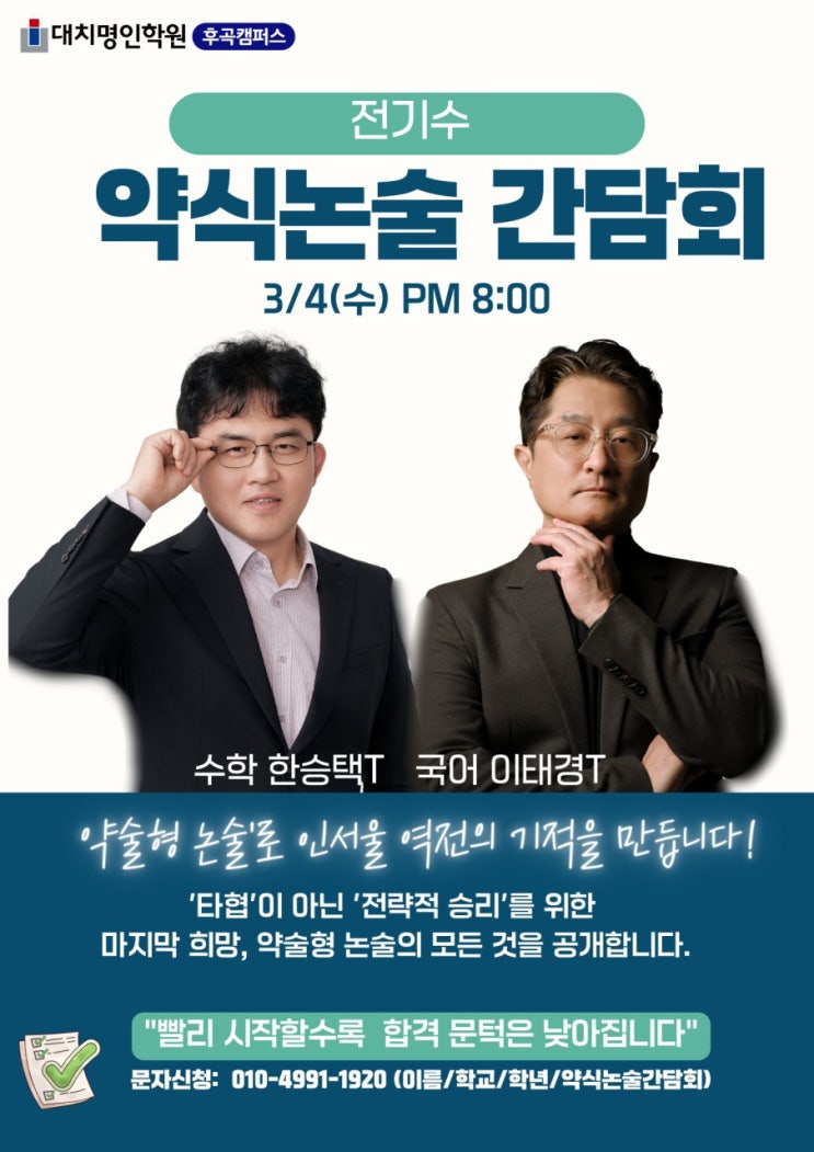 4~6등급의 기적! 약술 논술로 인서울 역전의 기적을 만듭니다! '타협'이 아닌 '전략적 승리'를 위한 마지막 희망, 약술 논술의 모든 것을 공개합니다. 3/4(수) PM 8:00 "내신 4등급, 수도권 대학 정말 불가능할까요?" 현실적으로 고1, 2 때 놓친 내신을 3학년 때 뒤집기는 쉽지 않습니다. 하지만 4~6등급 학생들에게는 아직 '인서울 입시 역전'의 강력한 카드가 남아있습니다. 왜 '약술 논술'인가요? 단순히 운에 맡기는 전형이 아닙니다. 철저히 준비하면 반드시 붙는 전략 전형입니다! ▪ 현실적인 인서울 전략: 가천대, 국민대, 상명대 등 주요 대학 및 간호/메디컬 학....... <img src="https://blogthumb.pstatic.net/MjAyNjAyMjFfMTMg/MDAxNzcxNjU3MDk1NjQx.HUmLOt0M8ZSFJnqSD_vQVuWGtmCcjEQM7KOcnIPHlN0g.LjUGeqcxclNwCvoBuyrLDf4MBgK1EmEbz5X4tp2yUfIg.JPEG/7_92dUd018svc1kx96us3mfuf5_t5dd5j.jpg?type=s3" />