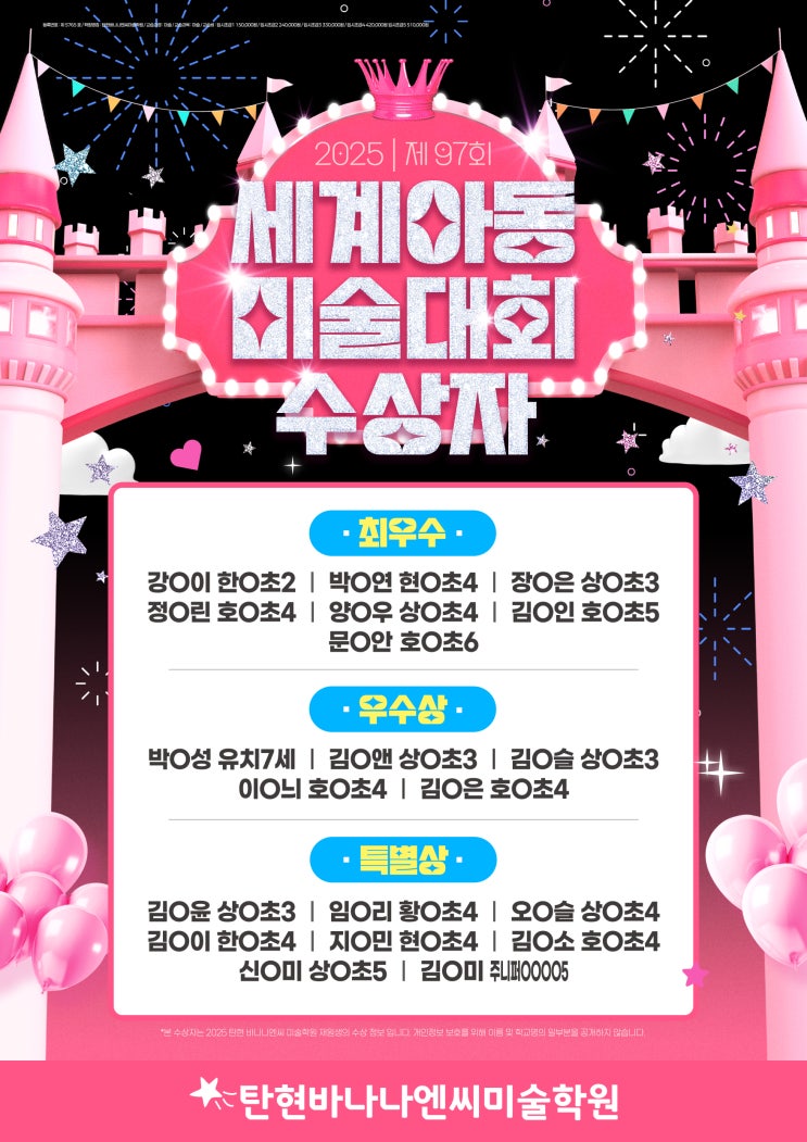 2025 제97회 세계아동 미술대회 수상소식 탄현 바나나엔씨 미술학원 아이들이 또 한번 해냈습니다! 이번 2025년 제 97회 세계아동미술대회에서 최우수상,우수상,특별상까지~!! 정말 자랑스러운 결과를 안고 돌아왔어요 단순히 "잘 그린 그림"이 아니라, ✨스토리 있는 표현력 ✨색감과 구도의 완성도 ✨자기만의 상상력을 끝까지 밀어붙이는 힘 이 세 가지를 중심으로 아이들 한명의 개성을 담아 그려보며 그 결과가 이렇게 값진 수상으로 이어졌습니다~!! 수상한 모든 아이들 진심으로 축하하고, 옆에서 묵묵히 응원해주신 부모님들께도 깊이 감사드립니다❤ 앞으로도 탄현 바나나엔씨 미술학원은 결과보다 과정, 성적보다 성....... <img src="https://blogthumb.pstatic.net/MjAyNjAxMDlfMTAx/MDAxNzY3OTQ0Mzk5MjIw.k4RPci-ZdZXG70khCnXbaFfqspWr7vNaWjBa_CEKRa4g.tniHVUMJoujMRECOzQqmpJnYuMQblJ27Ib-Jy9w5rH8g.JPEG/%C5%BA%C7%F6B_%BC%F6%BB%F3%C0%DA_%BC%F6%C1%A4.jpg?type=s3" />