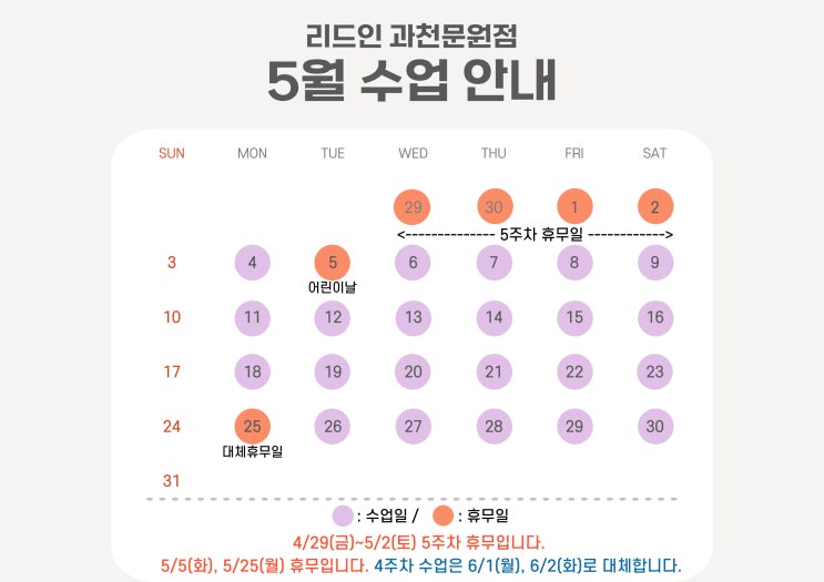 안녕하세요. 리드인 과천문원점입니다:) 짧은 봄이지만 그만큼 소중한 시간입니다. 가정의 달인 5월, 6월 아이들과 소중한 추억을 만드세요. 5월과 6월 수업 일정 안내드립니다. <img src="https://blogthumb.pstatic.net/MjAyNjA0MjhfMTEx/MDAxNzc3MzY1MzUzMDQx.k4AY__F02Mcbt2UdSJGw77hC-L-CpKeZjbE94h0zCaIg.98q--aY7aQE6P13qrHw49M3UbDXJwVJgVX0D1bS9Wt4g.JPEG/2605-1.jpg?type=s3" />