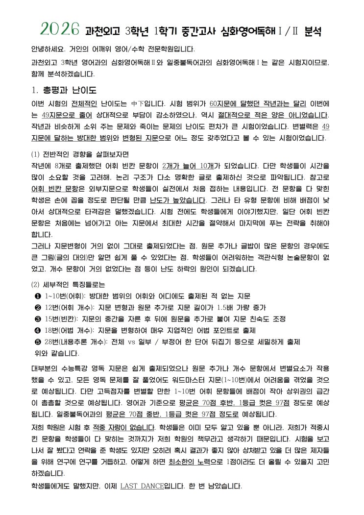 [과천외고_3학년] 1학기 중간고사 '심화영어독해 I/II ' 총평과 문항분석