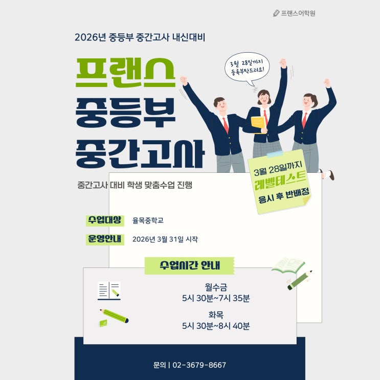 안녕하세요. 실력으로 지도하고 결과로 보여주는 지정타 프랜스영어학원입니다. 저희 지정타 프랜스영어학원 중등부 1학기 중간고사대비일정과 신입생 등록가능기한 관련하여 알려드립니다. 원생의 레벨테스트 응시 및 정규반 배정 후 내신대비가 가능합니다(정규반 미배정 시 내신대비 불가). 자세한 사항은 아래를 참고해주시기 바랍니다. 곧 저희 원에서 뵙겠습니다. 감사합니다. <img src="https://blogthumb.pstatic.net/MjAyNjAzMTZfMjY3/MDAxNzczNjQxMjg3NzEx.ZbpTxc9iKrZ0kYWpci9O6ZpKkjKJOTQ3lONlzlgVj34g.TeM9igvCAdKunXCPJf0PK6bsto1nWwE16xii5nLsWmsg.JPEG/%282026-3-14%29%C1%DF%B5%EE%B3%BB%BD%C5%B0%ED%BB%E7_%BE%CB%B8%B2%28%BA%D0%BF%F8%29.jpg?type=s3" />