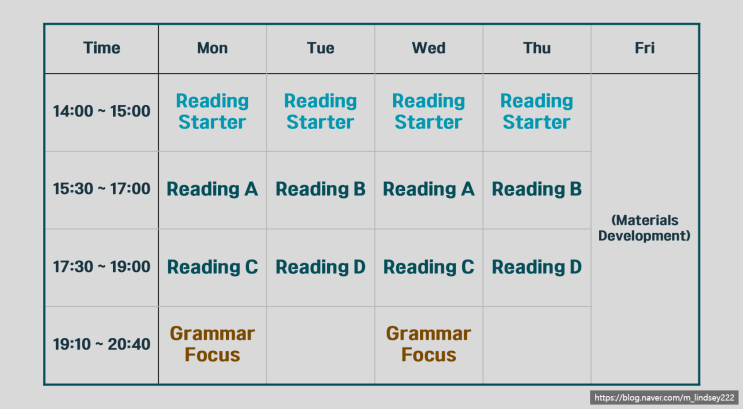 2026년 PLE 영어교습소 정규 시간표를 안내드립니다. 학기 중과 방학 중 시간표를 동일하게 운영하여 학부모님과 학생 모두 혼선 없이 안정적으로 수업에 참여할 수 있도록 구성하였습니다. PLE는 원서 리딩을 중심으로 한 시그니처 리딩 프로그램 A, B, C, D를 운영하고 있으며, 중등 대비를 위한 Grammar Focus 문법 집중반도 함께 운영 중입니다. 그리고 2026년부터는 초등 1~2학년을 위한 Reading Starter반이 새롭게 개설됩니다. Reading Starter는 주 4회 단일반, 정원 4명의 소수 리딩 클래스입니다. 그림책을 함께 읽으며, 말하기·표현·역할놀이·그리기 등 다양한 액티브 활동을 통해 아이들이 언어를 ‘공부’가 아닌 ‘경험’으로 받아....... <img src="https://blogthumb.pstatic.net/MjAyNjAyMjNfMTQ5/MDAxNzcxODQ5MDUxNjAx.j3GUCiBGyifJzoIrRm3rHpafSBzknyXw6XEr1QCe1i0g.B-iogki_FdWBtbYD0s82lJ3EtHOSuWQfRBLNYvy016Ug.PNG/2026_%C1%A4%B1%D4_%BD%C3%B0%A3%C7%A5.png?type=s3" />