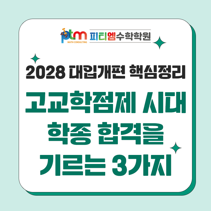 안녕하세요~ 구리시 수택동 소수이과전문 피티엠학원입니다. 2028학년도 대입 개편안이 확정되면서 예비 고1, 고2 학부모님들의 고민이 깊어지고 있어요. "내신이 5등급제로 바뀐다는데, 그럼 뭘로 평가하나요?" "고교학점제가 본격화되면 우리 아이는 어떻게 준비해야 하나요?" "학종에서 이제 무러 봐야 합격하나요?" 오늘은 2028 대입 개편의 핵심과 앞으로 학종 합격을 가르는 결정적 요소를 정확히 알려드릴게요. 결론부터 말씀드립니다!!! 2028 대입, 이것만은 기억하세요! "공부만 잘하면 된다"는 시대는 끝났어요. 학교 안에서 어떤 과목을 선택했고, 그 안에서 얼마나 깊게 탐구했는지가....... <img src="https://blogthumb.pstatic.net/MjAyNjAyMTNfMTk5/MDAxNzcwOTg5MDk5Njgy.hxVgP-EMxORLRCQqkKKNyq1jZzKf-yPwcWYFclir35Ig.-ZXhblk-3pQJYgd7DUZcE4LBB9cR4eoXE7onOQGQwFwg.JPEG/%B4%EB%C0%D4%B0%B3%C6%ED%C7%D9%BD%C9%C1%A4%B8%AE_%B8%DE%C0%CE.jpg?type=s3" />