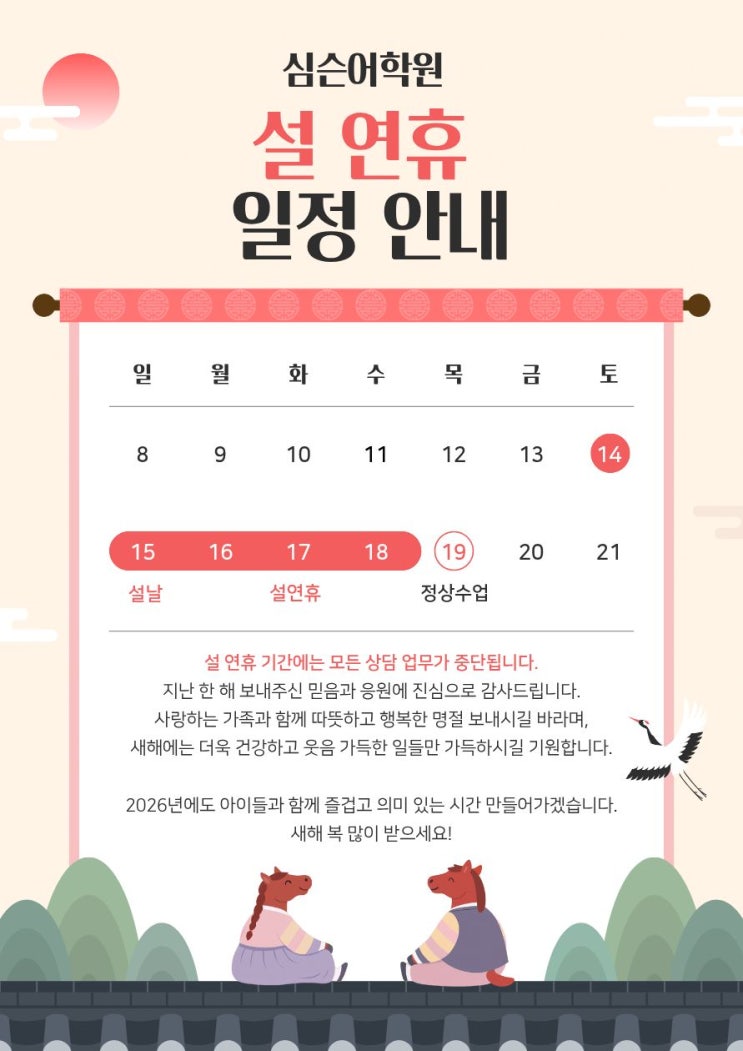 2026년 설 연휴 안내 및 병오년(丙午年) 새해 인사드립니다 안녕하세요, 위례 심슨어학원입니다. 2026년 병오년(丙午年), 붉은 말의 해에는 힘차게 달리는 말처럼 활기와 도전의 기운이 가득한 한 해가 되기를 기원하며, 여러분 가정에 건강과 행복이 늘 함께하시길 진심으로 기원합니다~ 2026년 설 연휴 일정 안내 다가오는 설 명절을 맞아 아래와 같이 연휴 일정을 안내드립니다. ✔ 설 연휴 기간 : 2026년 2월 14일(토) ~ 2월 18일(수) 해당 기간 동안은 운영이 진행되지 않으며, **2월 19일(목)**부터 정상 운영됩니다. 이용에 참고하시어 일정에 불편 없으시길 바랍니다. 병오년, 희망과 도약의 한 해 병오년은 밝은 에너지....... <img src="https://blogthumb.pstatic.net/MjAyNjAyMTNfMjgx/MDAxNzcwOTY0Mjg0NTYw.zOZzWhOgoTn7CAafcGbbZzSls4AUDtzuR6npomyilKQg.tgTzz09mZX_xp9w4k_p-suYAHxcMVwEGLHDl2pZ9iMgg.JPEG/%C1%A6%B8%F1%C0%BB_%C0%D4%B7%C2%C7%D8%C1%D6%BC%BC%BF%E4._%2838%29.jpg?type=s3" />