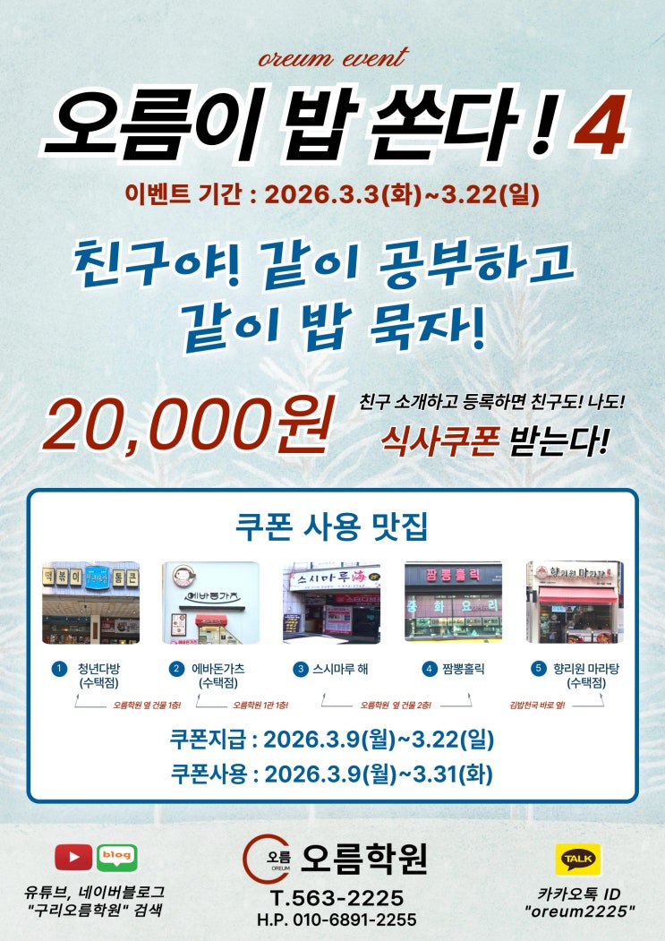 [오름학원] 2026 새학기 이벤트! 오름이 밥! 쏜다!4