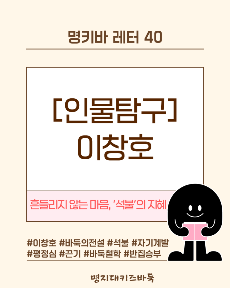 바둑의 전설 이창호, '반 집의 승리' 뒤에 숨겨진 인내의 가치 안녕하세요, 감정에 휘둘리지 않고 끝까지 집중하는 힘을 기르는 갈매바둑학원 명지대키즈바둑입니다. 오늘은 바둑계를 넘어 우리 삶에 깊은 통찰을 주는 인물, '석불' 이창호 9단의 이야기를 해보려고 합니다. 화려한 공격이나 현란한 기술 대신, 묵묵한 평정심으로 시대를 풍미했던 그의 발자취는 오늘날 우리에게 많은 것을 시사합니다. 왜 '석불(石佛)'인가? - 감정을 다스리는 힘 이창호 9단은 대국 중 표정 변화가 전혀 없기로 유명합니다. 유리한 상황에서도, 혹은 뼈아픈 실수를 한 순간에도 그의 얼굴은 마치 돌부처처럼 고요했죠. 감정 컨....... <img src="https://blogthumb.pstatic.net/MjAyNjAzMjBfMTIg/MDAxNzczOTc1OTg5MTAz.DICpLD_jOWaKwZoNq5ndN4FKoUMSzdZJGYpHpMjV9S8g.NvaGd7lF5F3J15zL2Cv3wpq8UDIoBrvcAFhXILyZAHMg.PNG/1.png?type=s3" />