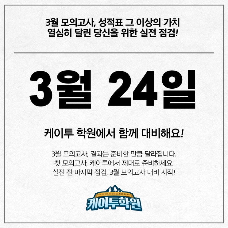 “아직 3월인데 괜찮겠지?” 이 생각이 가장 위험할 수 있습니다. 첫 모의고사는 지금 내 위치를 확인하고 앞으로 어떤 방향으로 공부해야 할지 알려주는 시험입니다. 케이투학원은 개념을 다시 점검하고 실수하는 유형을 잡고 실전 문제로 연습하고 틀린 문제까지 다시 정리하며 시험 전 흐름을 만들어가고 있습니다. 처음 보는 시험일수록 더 제대로 준비해야 합니다. 3월 모의고사, 케이투 고릴라와 함께 차근차근 준비하세요. <img src="https://blogthumb.pstatic.net/MjAyNjAzMjBfMTk4/MDAxNzc0MDA5OTkxODA4.b_uS-ew4be6LG8X4atcU4wSa3xvBHW2A4KHS7iWM9TYg.j8XG1hIEZ0Q7aD6p2uAGGcpo9AN8V5dKPR4E21x32rcg.JPEG/3%BF%F9%B8%F0%C0%C7%B0%ED%BB%E7-%B4%EB%BA%F1-001.jpg?type=s3" />