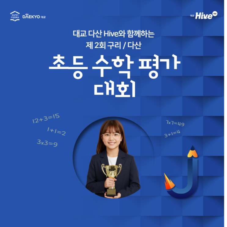 구리다산 초등학생이라면 누구나! 제2회 구리다산 초등수학평가 대회 개최! 초등 수학의 최강자는 누구? 제 2회 구리다산 수학평가 대회 개최 구리·다산 지역 초등학생들이 한자리에 모여 실력을 겨루는 제 2회 구리다산 초등수학평가가 2026년 3월 14일 토요일 다시 열립니다. 구리다산지역 학생이라면 누구나 도전해 볼 수 있는 기회, 이번에는 우리 아이가 주인공이 될 차례입니다. 참가자가 더 늘어나는「진짜 대회」 제 1회 대회에서는 약 150명의 초등학생들이 참여하여 그동안 쌓아온 실력을 마음껏 펼쳤습니다. 이번 대회에서는 더욱 많은 참가가 예상 되고 있어 초등 수학 최강자의 자리를 두고 치열한 도전이 이어질 예정입니다. 학교....... <img src="https://blogthumb.pstatic.net/MjAyNjAyMTBfMjEw/MDAxNzcwNjg0NDE0NDM4.mFVdmZO_LSY8wUYSiR9Ss4IwBKfuo2EcZT491Ue-QDsg.x36ImCAT_kr04z0YzbkL1Nbz5a80aPo0h5V4a7xXS-sg.PNG/%BA%ED%B7%CE%B1%D7%C6%F7%BD%BA%C6%C3%BF%EB.png?type=s3" />
