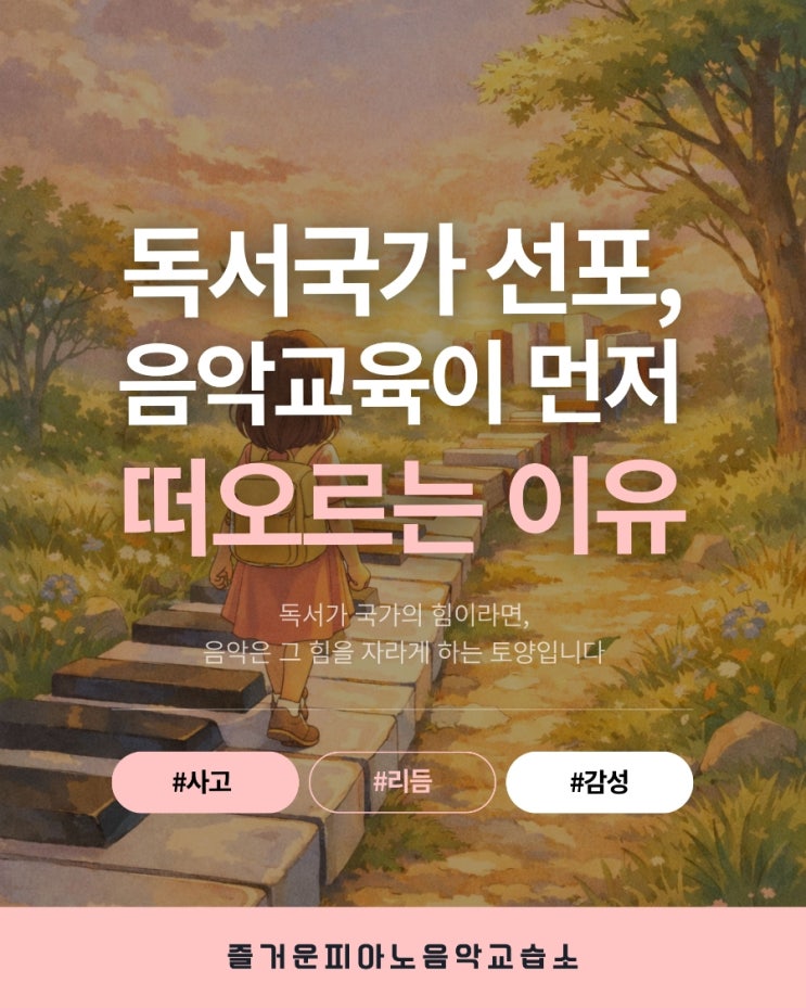 최근 '독서국가'라는 말이 자주 들립니다. 국가 차원에서 독서를 중요한 가치로 선언한다는 것은, 이제 교육의 중심이 단순한 성취가 아니라 ✅️ 사고력과 해석력으로 옮겨가고 있다는 신호이기도 합니다. 하지만 우리는 한 가지를 함께 생각해봐야 합니다. ❓️아이들은 과연 어떻게 '읽을 준비'가 되는가 하는 질문입니다. 책을 읽는 능력은 어느 날 갑자기 생기지 않습니다. 글자를 많이 본다고 해서 깊이 읽는 힘이 자라지는 않습니다. 아이들이 책을 이해하고, 문장을 해석하고, 자기 생각으로 연결하기 위해서는 그보다 먼저 필요한 경험이 있습니다. ❗️바로 듣고, 느끼고, 흐름을 이해하는 경험입니다. 음악은 그....... <img src="https://blogthumb.pstatic.net/MjAyNjAyMTFfNjIg/MDAxNzcwNzYyNjk0Nzgy.aujchVKQKCmlt6gTF-_IJGzKg6w8a2b8m-pxpoi9pp4g.bFUoNQXvFmdgSTUD6w4s-BzUXId34G7r95A32CUd3Qkg.JPEG/900%A3%DF1770614031103.jpg?type=s3" />