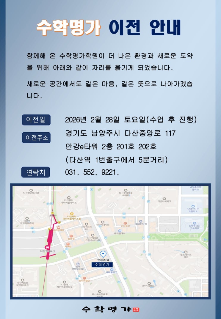 <개강일> 3월 3일부터 순차개강 구리에서 남양주로 이전하는 관계로 구리사랑카드 결제는 2/26까지만 가능함을 안내드리오니 참고해주세요 <img src="https://blogthumb.pstatic.net/MjAyNjAyMTlfMjY2/MDAxNzcxNDk1MjI0MDk2.476x5q854jTTpB5SIXA5Dq-G7Y5ChwdV74Bulyg6uCEg.Tg_hekk6s8_wG1o4MOA8c0ZmPJ81zPL-R14nQ49K4fcg.JPEG/%BC%F6%C7%D0%B8%ED%B0%A1_%C0%CC%C0%FC_%BE%C8%B3%BB_page-0001.jpg?type=s3" />