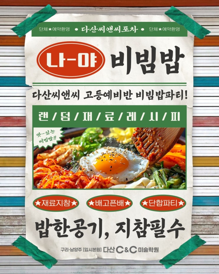 안녕하세요! 남양주 다산 C&C 미술학원입니다. 오늘은 고등예비반 친구들과 함께한 아주 특별하고 재미있는 시간을 소개해드리려고 합니다! 바로 비빔밥 파티인데요~ 이번 이벤트는 조금 재미있는 규칙이 있었습니다. 아이들이 각자 좋아하는 비빔밥 재료를 랜덤으로 하나씩 준비해오는 것! 각자 밥 한 공기와 본인이 고른 반찬을 하나씩 들고 모였답니다. 어떤 친구는 계란후라이, 어떤 친구는 나물을 또 어떤 친구는 참치나 고기를 가져오기도 했습니다. 덕분에 테이블 위에는 정말 다양한 재료들이 모여 세상에서 하나뿐인 비빔밥이 완성되었습니다 ㅎㅎ 열심히 듣고 구경하는 학생들 ♥ 짜잔 재료가 모두 모인 비빔밥입니다!! 어떤 친구....... <img src="https://blogthumb.pstatic.net/MjAyNjAzMTRfMTUy/MDAxNzczNDU2ODIwODI1.7YqxeyFsgxnmCd6WPzLKRbdIzZEp5GEevyGJZ6FOa0Ag.Ch39I5AVdPJpqwDaoGECxk4UK_GEayhnfRZkfOUYAjwg.JPEG/f_70dUd018svciad2l8ji6ajj_teug17.jpg?type=s3" />