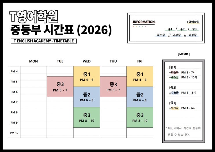 [ T영어-중등부 ] 2026년 중등부 시간표