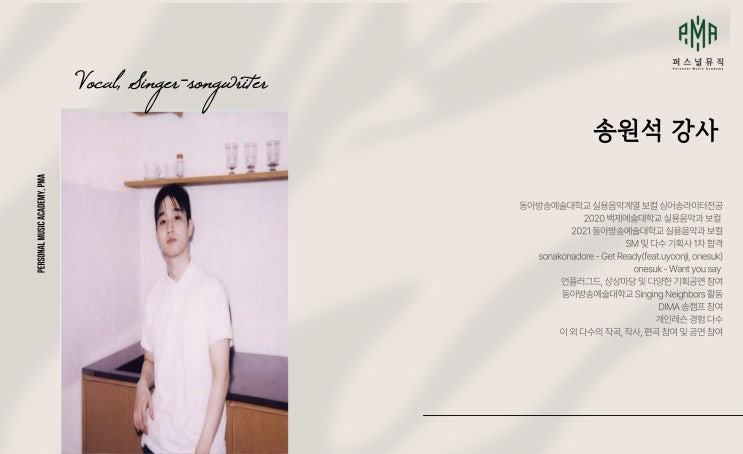 안녕하세요 퍼스널뮤직 실용음악학원입니다. 동아방송예술대학교 실용음악과 싱어송라이터 전공으로 디지털 싱글 앨범 발매와 피쳐링 참여 등 다양한 활동 경험이 있으신 송원석 강사님을 소개합니다 :) 다양한 작품활동과 다수의 공연 경력을 바탕으로 보컬, 기타, 싱어송라이터 등 다양한 파트를 지도해주실 선생님입니다. 퍼스널뮤직 실용음악학원 문의: 031-522-6479 카카오톡 채널: 퍼스널뮤직 실용음악학원 경기도 남양주시 다산중앙로 146번길 12-1 4층 405호 (베스킨라빈스 롯데캐슬점 상가) #남양주실용음악학원 #다산실용음악학원 #다산피아노학원 #다산음악학원 #다산보컬학원 #다산작곡학원 #다산입시학원 #실용음악입시학원 #다산미....... <img src="https://blogthumb.pstatic.net/MjAyNjAxMjFfMTYz/MDAxNzY4OTgyMTE5MzQw.Cjs5SdjwCm8clTmDGR3Afts26_Di4SdekTM9pDMZ334g.XVi8fqd4srPy_LlSIVQjucQBkzztY97fytkPQsE3gB4g.JPEG/%B0%AD%BB%E7%BC%D2%B0%B3-021.jpg?type=s3" />