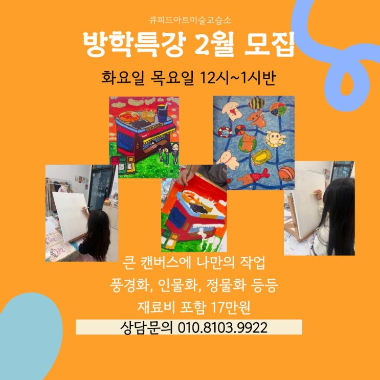 2월동안 화요일, 목요일 12시~1시반 수업입니다. 큰캔버스에 아크릴 또는 오일 파스텔 등 다양한 재료를 이용해 채색하는 기법을 배웁니다. 방학동안 멋진 작품을 만들어봐요^^ 상담문의는 010.8103.9922로 연락주세요! <img src="https://blogthumb.pstatic.net/MjAyNjAxMjNfMjI2/MDAxNzY5MTM5NjUwNzg0.Jx21N-IdPDcMQB8BmoNkORZDxmXsypkgCF0PvlAxwcAg.xt8LT-Jv0bUZxr-4CW9AS1FecgMC85k6khs2ITQ6NPMg.JPEG/%C1%A6%B8%F1%C0%BB_%C0%D4%B7%C2%C7%D8%C1%D6%BC%BC%BF%E4._%283%29.jpg?type=s3" />