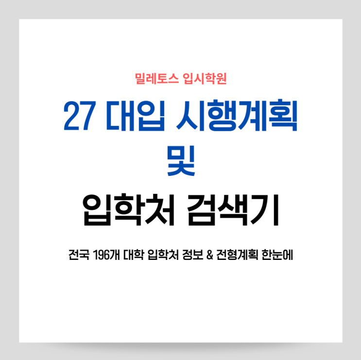 2027학년도 대학입시를 준비하는 수험생과 학부모님께 꼭 필요한 전국 주요 대학의 입학전형 시행계획 및 입학처 바로가기 자료를 소개합니다. 2027학년도 대학입시는 변동 사항이 많지 않지만, 대학별 전형요소와 입학처 정보를 미리 파악해두는 것은 매우 중요합니다. 특히 수시·정시 준비를 시작하는 고등학생들에게는 ‘어떤 전형이 나에게 유리한지’를 판단하는 기준이 되기 때문입니다. 경기도교육청 콘텐츠팀에서 제작한 것으로, 196개 대학의 입학처 홈페이지와 2027학년도 입학전형 시행계획 페이지를 함께 연결할 수 있는 구조로 구성되어 있어, 학교별로 필요한 정보를 빠르게 확인하실 수 있도록 설계되어 있습니다. 자료 확인....... <img src="https://blogthumb.pstatic.net/MjAyNjAxMjdfMTEg/MDAxNzY5NDQzNjU3NTQ5.OfoRYcW4Ali2LeuhO6uGtMjXv8dD76Pm-qZ2ZvwjDVsg.nCmLX8dejiHmakOV4Ndcx8A3keizWvNive3099_Edvsg.PNG/Screenshot_2026-01-27_010709.png?type=s3" />