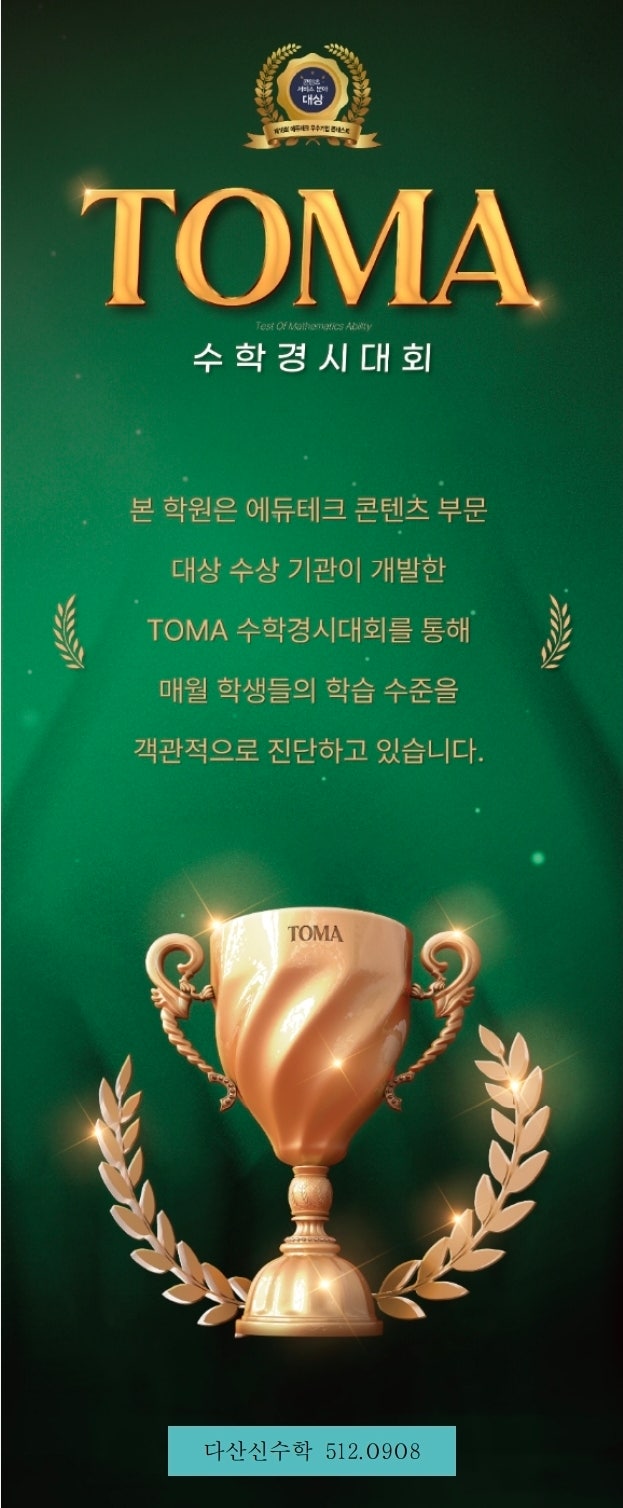 안녕하세요! 다산신수학입니다. 수학 공부, 열심히는 하고 있는데 우리 아이가 전국 단위에서는 어느 정도 수준인지, 어떤 부분이 부족한지 궁금하셨죠? 매달 객관적인 지표로 실력을 점검할 수 있는 TOMA(Test Of Mathematics Ability) 수학경시대회를 소개합니다! TOMA 수학경시대회란? 에듀테크 콘텐츠 부문 대상 수상 기관에서 개발한 공신력 있는 평가 시스템입니다. 단순히 점수만 나오는 시험이 아니라, 아이의 학습 수준을 객관적으로 진단하고 앞으로의 학습 방향을 잡아주는 나침반 역할을 합니다. 대회 상세 안내 학부모님들께서 가장 궁금해하실 핵심 정보들을 정리해 드립니다. 대 상 초등 1학년 ~ 중등 3학년 응시....... <img src="https://blogthumb.pstatic.net/MjAyNjAzMDVfMTkz/MDAxNzcyNzE5NDA4Mzc2.vQ40sB8-WWKiv76pF96PuHah5mhD52TGY3mJpILEnJ8g.k700ZU5gGfymAa5wSvKiUmgNmElnrYUnGprbMd6a3Vkg.JPEG/Screenshot%A3%DF20260305%A3%DF143246%A3%DFPolaris_Office.jpg?type=s3" />