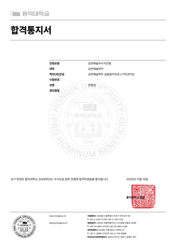 본원에서 연습중인 조현성 (오남고 3 색소폰 전공)군이 홍익대에 최종 합격했습니다. 워낙 잘하는 친구라서 호원대, 서경대도 합격을 했으나 본인이 홍익대를 선택해 전공을 이어 가기로 결정을 했네요. 이제 홍대 재즈 카페엘 가면 우리 현성이 연주를 들어볼 수 있겠네요. 중 1부터 저희 학원에서 나와서 연습하던 아이였는데 이젠 어였한 연주자로의 길을 걸어 갈 수 있겠네요. 앞으로 무궁한 발전이 있기를 바래봅니다. <img src="https://blogthumb.pstatic.net/MjAyNTEyMjVfMTc4/MDAxNzY2NjYwMDM4NzE3.6EudMBdIB6rHLnqce5CVR6qD6pWyCNUaeNjGf-YfUUog.W7bFjVqRqyJfC-kWI4FQejwENgALk-21nJt8rF4Rv2Yg.PNG/KakaoTalk_20251225_101358776.png?type=s3" />