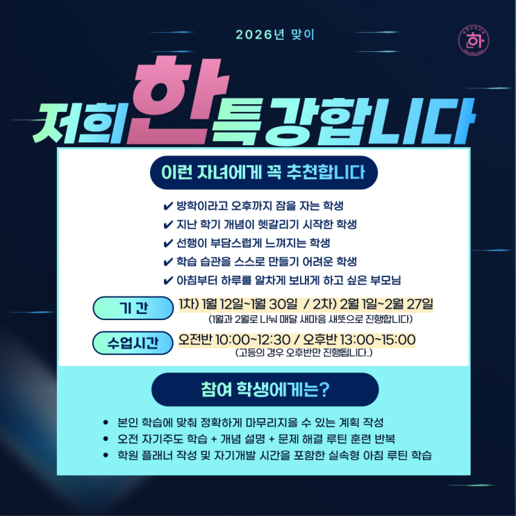 안녕하세요. 항상 "대입"까지 생각하면서 수학을 가르치고 입시를 준비하는 바른수학교육 한 학원입니다. 어김없이 2026년 한 해가 밝았습니다. 시간이 흐르는 것처럼 학생들은 또 공부를 해나가야되고, 늘 방학만큼은 시간을 아낌없이 잘 활용해야된다는 막대한 "사명감"에 불타올라 이번에도 어김없이 특강을 계획했습니다. 저희 한 특강합니다 여름 방학에 처음으로 시작했던 개별수업 특강입니다. 이번 겨울에는 보다 체계적으로 진행하려고 합니다. ○ 신청 학생들의 신청은 구글폼으로 신청을 받습니다. (이번 특강은 인원에 제한이 있습니다.) ↓↓↓↓↓ 신청링크 ↓↓↓↓↓ ○ 신청 인원에 대한 상담 및 계획 작성....... <img src="https://blogthumb.pstatic.net/MjAyNjAxMDJfMzkg/MDAxNzY3MzQ4OTI0NTg3.xO5o3kq4ljqOTsgTTLNqBZAH35YjgauYvHsO_yaF1wkg.72YkGtBuzGjwzpk_QXPt7HkWIcVHeH3Ijz0XSl95-9Ag.PNG/2026-%B0%DC%BF%EF%B9%E6%C7%D0-%BD%C3%B0%A3%C7%A5_%BA%B9%BB%E7%BA%BB-001.png?type=s3" />