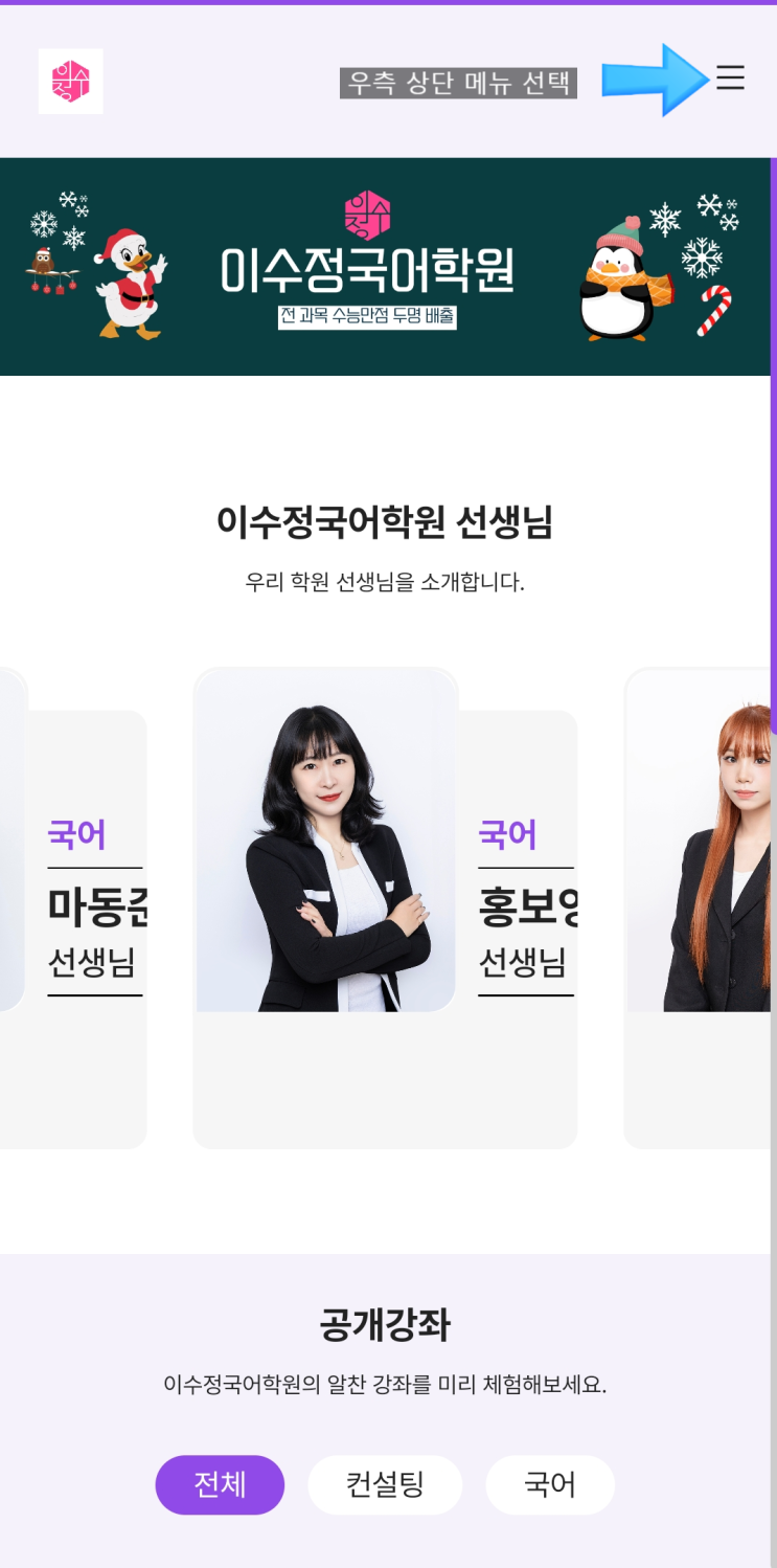이수정 국어학원 인강을 통해 특강, 내신, 모의고사 콘텐츠를 자유롭게 학습할 수 있습니다. 수강 방법은 아래와 같습니다. 사이트 : 이수정국어학원 회원가입: PC 및 모바일 기기를 통해 간편하게 가입 (문의 사항은 조교 및 담당 교사에게 연락) 강좌 신청: [전체강좌] 메뉴에서 본인의 수강 과목 선택 및 신청 학습 시작: [마이페이지]에서 신청 내역 확인 후 수강 온·오프라인 병행 학습으로 이번 방학을 알차게 보내어 최고의 성과를 거두길 바랍니다. [ pc 버전 ] [ 모바일 ] <img src="https://blogthumb.pstatic.net/MjAyNjAxMDRfMzcg/MDAxNzY3NTA4NjIxMjQw.hAtZECb5VaxI_f433D5iXaS5sBY1HXvkY5KbF8gdBFog.8wbLWq5UqLRgqLVhYeKsI-a8qfiPhEjWWNykq4acoiwg.PNG/image.png?type=s3" />
