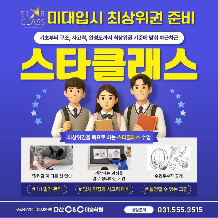 안녕하세요! 구리·남양주 입시본원 '다산C&C미술학원'입니다. 오늘은 고등 디자인 입시를 준비하는 학생들 중에서도 상위권·최상위권을 목표로 하는 '스타클래스'수업이 어떤 방식으로 진행되고 있는지 소개해드리려고 해요 [ STAR CLASS ] 수업은 '많이 그리는 수업'이 아니라 '왜 이렇게 그려야 하는지'까지 설명할 수 있는 그림을 목표로 합니다. 그래서 수업 초반부터 사물을 그냥 그리는 방식이 아닌 구조를 나누고, 분해하고, 다시 조합하는 연습부터 시작합니다. 사물을 분해하고 구조로 이해하는 수업 헤드폰, 게임기, 시계, 생활 소품 등 익숙한 사물들을 하나씩 뜯어보듯 분석....... <img src="https://blogthumb.pstatic.net/MjAyNjAxMzFfMTI5/MDAxNzY5ODQyMTkzNzcy.q-TvS_kPVPTUt5h-bx4OojFzeNQXLjGamI6pEnXTLD8g.5X1X-Av2iAp26GmjdJcnznlQFnrs2Dt-utAjMdW4EmIg.JPEG/%C1%A6%B8%F1%C0%BB_%C0%D4%B7%C2%C7%D8%C1%D6%BC%BC%BF%E4._-_2026-01-31T154904.855.jpg?type=s3" />