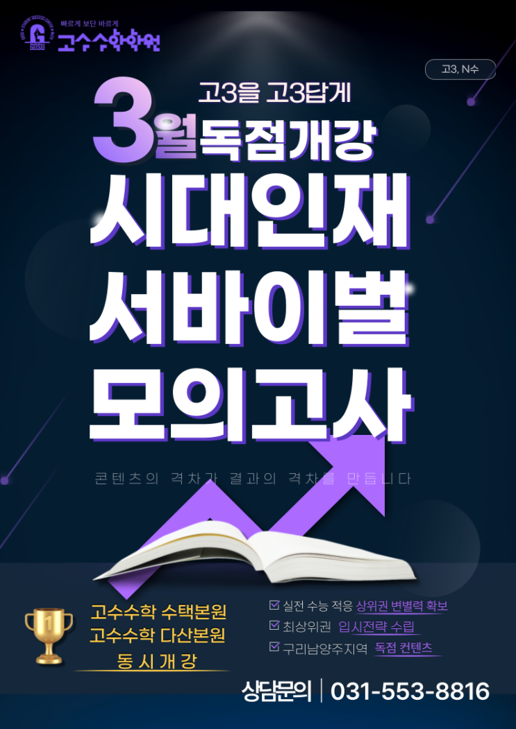 안녕하세요, 고수수학학원입니다. 2026학년도 대입을 준비하는 수험생들에게 가장 압도적인 무기가 될 소식을 전해드립니다. 고수수학학원이 구리·남양주 지역 최초이자 유일하게 '시대인재 서바이벌 프로' 계약을 체결했습니다. 이제 멀리 대치동까지 가지 않아도, 우리 지역에서 수능 최상위권의 상징인 '시대인재'의 콘텐츠를 그대로 경험할 수 있습니다. 왜 '시대인재 서바이벌'이어야 하는가? 상위권 학생들 사이에서 '서바이벌'은 단순한 사설 모의고사가 아닙니다. 수능의 흐름과 난이도를 가장 현실적으로 반영한 현존 최고의 실전 콘텐츠로 평가받습니다. 압도적인 문항 퀄리티: 최신 수능 트....... <img src="https://blogthumb.pstatic.net/MjAyNjAyMDJfNSAg/MDAxNzcwMDEzNDkyODA2.T08FEa8VqB7SbPl3Pw5oCcXm6CqrLIIOLZdBFQs7-3Mg.Ho9TbXz1OiNnwD6kMPI_q0lkMvbd_BOE67N4mepZNGIg.PNG/%C1%A6%B8%F1%C0%BB-%C0%D4%B7%C2%C7%D8%C1%D6%BC%BC%BF%E4__%BA%B9%BB%E7%BA%BB-003_%283%29.png?type=s3" />