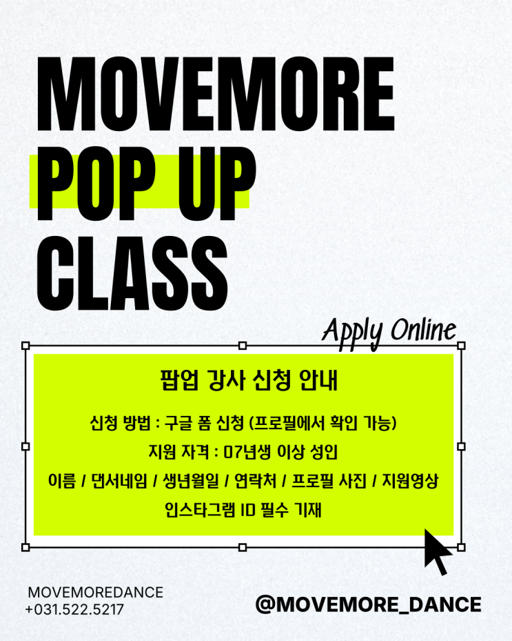 안녕하세요~~ #다산댄스학원#무브모어댄스 입니다! 오늘 소개드릴 수업은 다시 찾아온 #팝업 클래스 입니다!! POP-UP CLASS 금요일 19:00-20:30 (90분) 팝업 클래스는 매주 금요일 19시부터 20:30시 진행되는 수업으로 #무브모어댄스 강사뿐만 아니라 외부에서 활동하시는 다양한 강사분의 춤을 배울 수 있는 클래스입니다! 이번에 진행된 팝업 클래스는 TEMBER 강사님의 수업입니다! [ TEMBER POP-UP CLASS ] 외부에서 댄서네임 TEMBER로 활동하고 계시는 독특하면서도 높은 퀄리티와 카리스마를 보여주는 멋있는 댄서이십니다! 매주 금요일에 열리는 팝업은 내원생뿐만 아니라 외부 수강생도 모두 들을 수 있는 수업입니다 이번 팝업 클래스도....... <img src="https://blogthumb.pstatic.net/MjAyNjAyMjBfMjc1/MDAxNzcxNTgzMzMzMTYy.yQ06MFWWC3cSbPoQ4XH3zRGUSwGSfkSVSLpPv3dv-Rog.S2vUrI4c0AJp5Wr6tRO0Urtt1CiHDMV6r8lh7JlPsW4g.PNG/%B0%AD%BB%E7-%BD%C5%C3%BB-%C6%F7%BD%BA%C5%CD-%C3%D6%C1%BE%BA%BB-001_%281%29.png?type=s3" />