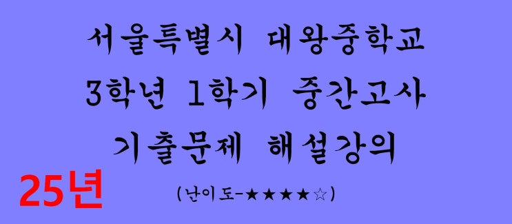 2026학년도 1학기 중간고사 시험대비 중학교 3학년 1학기 중간고사 기출문제 해설강의입니다. 서울특별시에 있는 대왕중학교 2025학년도 기출문제입니다. 시험범위는 제곱근과 실수, 식의 계산과 이차방정식 입니다. 난이도는 상 입니다. 일반중학교 시험보다 살짝 어려운 문제들이 있습니다. 항상 무리수인 것을 고릅니다. 최단거리로 갈 수 있는 경로를 찾은 뒤, 거리를 구합니다. 전개식을 보고 다항식의 곱을 유추해 낼 수 있습니다. 다항식을 전개해서 비교합니다. 사각형의 길이와 넓이를 이용해서 식을 쓴 뒤, 인수분해해서 계산합니다. 다른 문제들과 더 자세한 해설은 동영상 해설강의를 참고하세요 유튜브 회원가입하시면 전국학교기출....... <img src="https://blogthumb.pstatic.net/MjAyNjAyMjZfNzUg/MDAxNzcyMTAzNTE1NDky.HvVw1vowhEInlmdkP-qEt1CUh3F7ZBLPb-YliZ82HGkg.gcCuiZXcr6XREmzFe38V9-OkhfqKOIWD7aOPtguy6XAg.JPEG/1360.jpg?type=s3" />