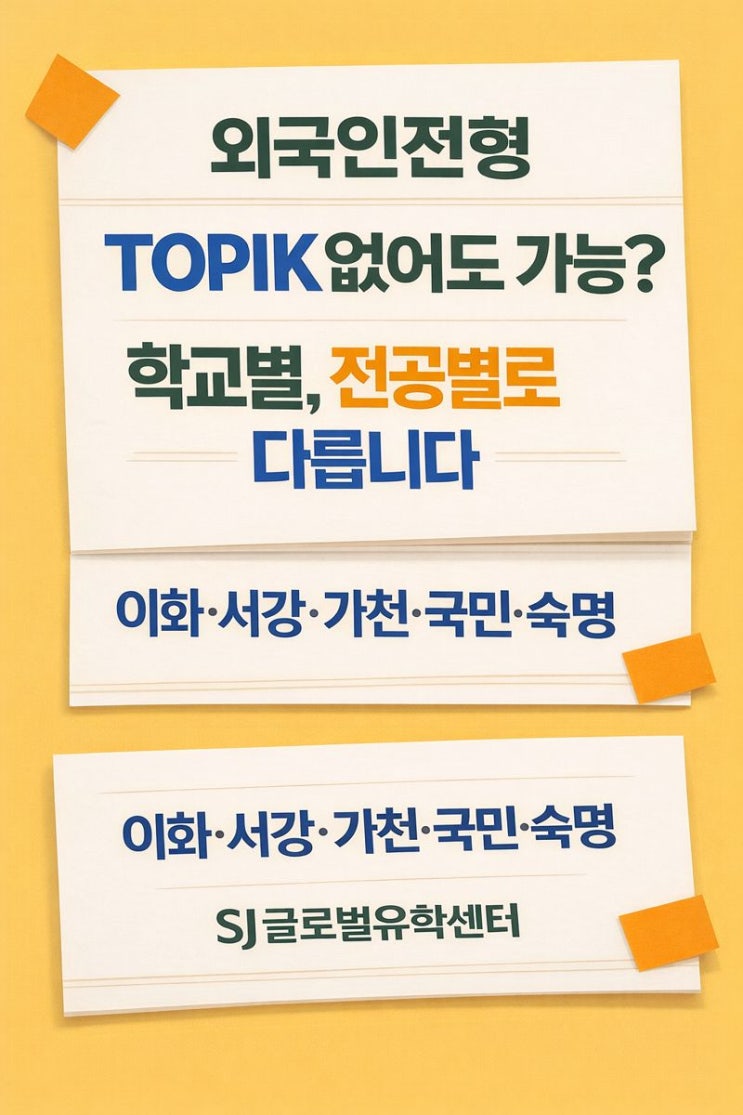 토픽 없어도 가능한 외국인전형 이화·서강·가천·국민·숙명여대 전공별 정리 외국인전형 상담을 하다 보면 가장 많이 듣는 질문이 있습니다. “이 대학은 TOPIK 없어도 된다던데요?” 하지만 실제 모집요강을 보면, 모든 전공이 가능한 것은 아니고, ‘특정 전공·특정 트랙’만 예외적으로 허용되는 경우가 대부분입니다. 이번 글에서는 ✔️ 학교별 전형 특징 ✔️ TOPIK 없이 가능한 전공 유형 ✔️ 주의해야 할 핵심 포인트 를 모집요강 기준으로 정리해드립니다. 1️⃣ 이화여자대학교|호크마교양대학 글로벌학부 전형 특징 외국인전형에서도 전공 적합성·학업 역량을 매우 중요하게 평가 TOPIK 필수 전공과 예외 전공이 명확히 구분됨....... <img src="https://blogthumb.pstatic.net/MjAyNTEyMjdfMjYz/MDAxNzY2ODIwMjYxOTQ4.5ePl4l1FYiCKlwls3PChbES8iGu9on9Ds20MJytyS74g.jihp6uUTiqZnDIzEZx6C5mq2mu053HsP7F-EaDm8UVog.JPEG/adcc6611-b8d0-47ba-afd0-8c2d4803e9bc-md.jpeg?type=s3" />