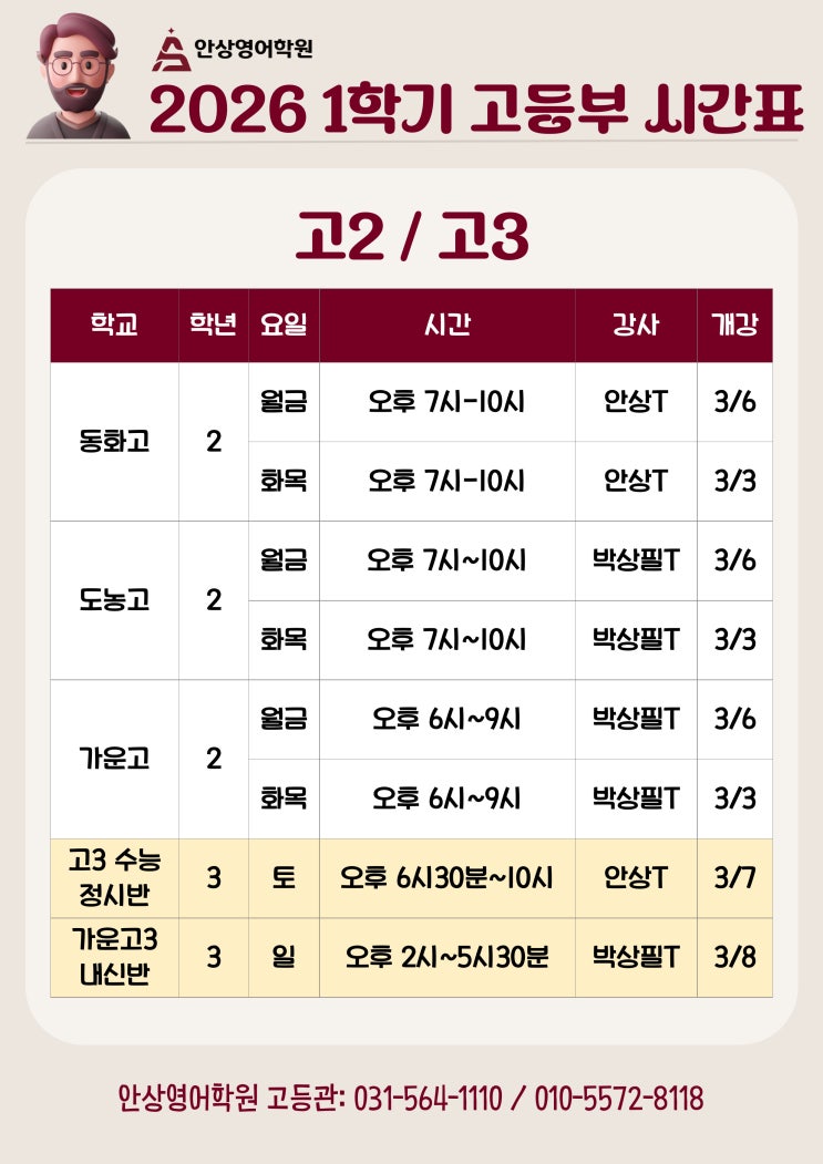 [고등부]2026년 고등부 1학기 고2/고3 시간표!! #동화고#도농고#가운고#다산동영어학원[안상영어학원]