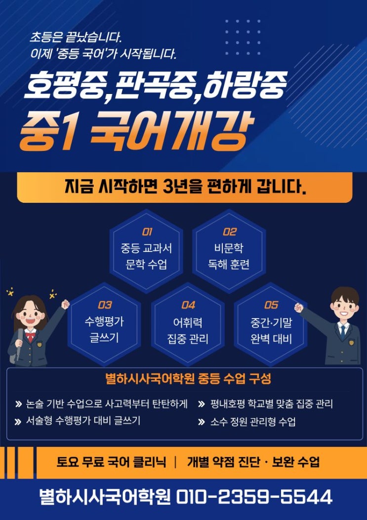 안녕하세요~ 별하시사국어학원입니다~^^ 초등이 끝났습니다. 이제 진짜 ‘중등 국어’가 시작됩니다. 초등 때는 감으로 풀리던 문제들이 중학교에서는 **‘논리’와 ‘독해력’**을 요구합니다. ✔ 교과서 문학 작품 분석 ✔ 비문학 독해 훈련 ✔ 서술형 수행평가 글쓰기 ✔ 어휘력 집중 관리 ✔ 중간·기말 완벽 대비 특히 비문학이 약한 아이들은 중1 2학기부터 급격히 힘들어집니다. 그래서 지금 시기가 가장 중요합니다. 지금 시작하면 3년이 편합니다. 중1에서 개념과 독해 습관이 잡히면 중2, 중3은 ‘심화’만 하면 됩니다. 하지만 중1을 놓치면 3년 내내 따라가기 바빠집니다. 별하 중등 국어는 이렇게 다릅니다. ✔ 논술 기반 수업으로 사....... <img src="https://blogthumb.pstatic.net/MjAyNjAyMjRfMTAw/MDAxNzcxOTM4MzU0ODA2.tlCVfKw87DZiF-HrsasjFR_N3b9ydSOtSXSCmQz6YFog.B89yLOZo8Y8WP7mcoBrNRGZHJbfb8tJgFgEVRIrqOzIg.JPEG/%BF%B9%BA%F1%C1%DF1%C0%FC%B4%DC%C1%F6.jpg?type=s3" />