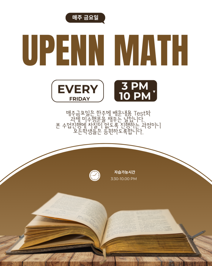 수업료가 따로 추가되는 수업이 아닙니다. 강제하는 수업도 아닙니다. 시간제한이 있는 수업도 아닙니다. 본수업을 제외한 금요일 수업은 한주에 배운 내용을 정리하고 채우는 과정으로 진행 되거나 과정을 끝냈다면 주간Test시행 또는 결석을 한 친구들은 보충으로 진행되는 수업입니다. 그렇기에 금요일수업의 결석보충은 따로 진행되지 않습니다. 수업시간 과제 미수행과 피드백으로만 채우게 되는 수업을 방지하고자 진행되는 수업입니다. 유펜수학은 아이들을 개인별 커리로 수업을 진행하고 관리를 하고 있습니다. 본수업은 개인별 맞춤커리큘럼으로 철저히 금요일은 관리형 수업으로 빈곳없이 철저히 유펜학원은 늘 해왔던 그대로 아이들....... <img src="https://blogthumb.pstatic.net/MjAyNjAzMTBfMjgy/MDAxNzczMTIwMjU0MzMz.xLklfRHO8AXbC4EzVZ5hWCBdCeuU9hqGAM_L9HQyyPgg.rSqOCRnly6myETabJqcoTWeY44FAjamqhkaJ9zNWPqMg.PNG/Brown_and_White_Simple_Bible_Study_Instagram_Post_%283%29.png?type=s3" />