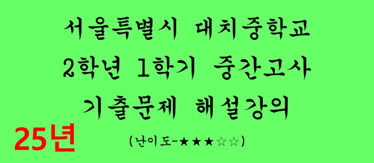 2025학년도 1학기 중간고사 시험대비 중학교 2학년 1학기 중간고사 기출문제 해설강의입니다. 서울특별시에 있는 대치중학교 2025학년도 기출문제입니다. 시험범위는 유리수와 순환소수, 식의 계산 입니다. 난이도는 중으로 평이합니다. 분수를 직접 나눠서 순환마디를 찾은 뒤, 계산합니다. 순환소수를 분수로 바꾼 뒤, 통분해서 계산합니다. 주어진 식을 m 에 관한 식으로 정리합니다. 복잡한 식의 계산문제인데, 복잡할수록 천천히 한번에 실수없이 차근차근 풀어냅니다. 다른 문제들과 더 자세한 해설은 동영상 해설강의를 참고하세요. ^^ #1학기중간고사수학 #1학기중간고사시험지 #중2-1중간고사시험지 #내신수학시험지 #내신수학풀이 #대....... <img src="https://blogthumb.pstatic.net/MjAyNjAzMTFfMjM1/MDAxNzczMTk5Mzc2ODgy.4O387I8zERw2IfSOnOGJi1l87bra3FsOaDci11tG6DMg.lN7KIJN91fQ27VG-ie2HWHw9P2zqGg8HnBOgE0BqvZAg.JPEG/1363.jpg?type=s3" />