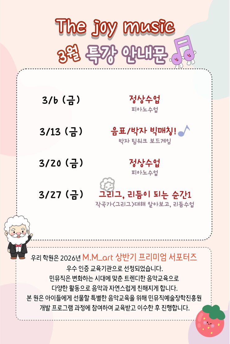 새학기 시작 3월, 음악으로 채워가는 더조이음악학원입니다. 원일초피아노 원일초바이올린 원일초통기타 더조이음악학원 3월 특강안내 바이올린 수업 : 매주 목요일 2:30~6:00 -선착순모집 -방과후 단체수업과는 차원이 다른수업 -1:1 30분 개인레슨 기초부터 탄탄하게! 설렘 가득한 3월, 통기타 수업 : 매주 수요일 3:00~6:00 -선착순모집 -실용음악졸업 & 다수 방송ost녹음경력 전문선생님 -1:1개인레슨 (30분/50분 선택가능) 3월 융복합 예술특강안내 더조이음악학원은 민뮤직 예술장학진흥원 프리미엄 서포터즈로써 우수인증 교육기간으로 오산 독점 , 원일초 유일 저희학원만 단독으로 특별한 음악특강은 진....... <img src="https://blogthumb.pstatic.net/MjAyNjAzMDNfMTUx/MDAxNzcyNDY3OTk0MDky.iykWjnMjwtsBkFdBTTo0GAnIc2qdb1on2NZRbGSou14g.1t54PhWlq0MyltjtYTKigWUb51zhYh5pxmceK8hadyog.JPEG/2026_2%BF%F9.jpg?type=s3" />